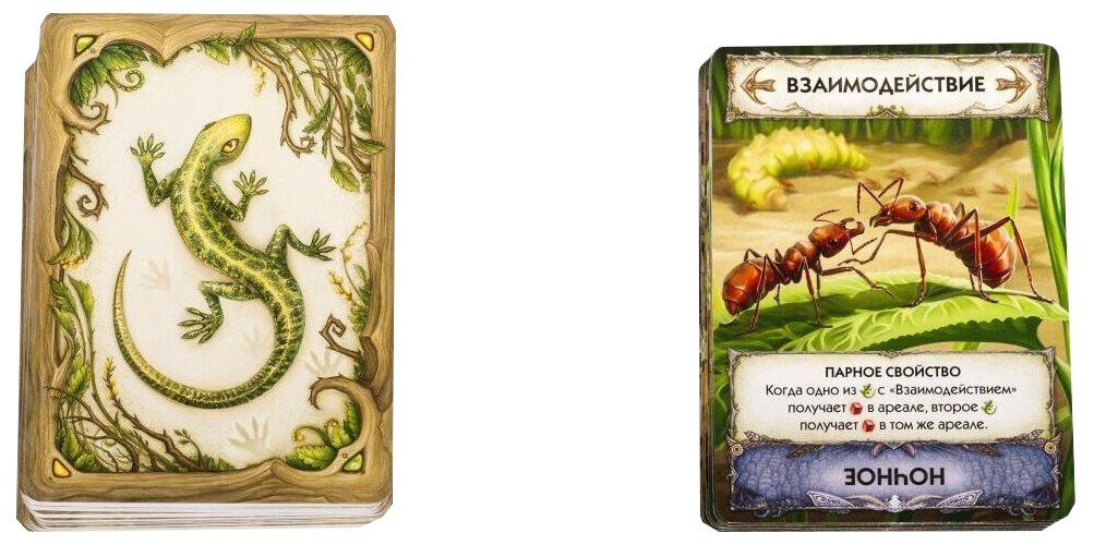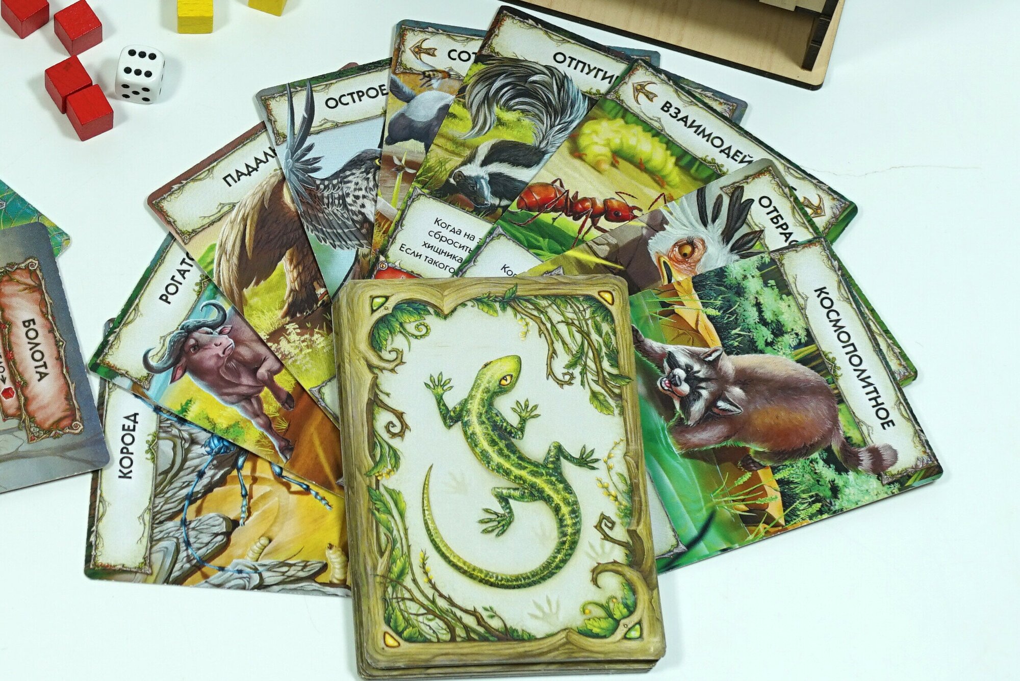 | Комплектация | 96 карт эволюции, 20 карт ареалов, 1 кубик, деревянные фишки, правила игры, справочник, 4 памятки игрока, 2 памятки свойств, 1 фигурка первого игрока |