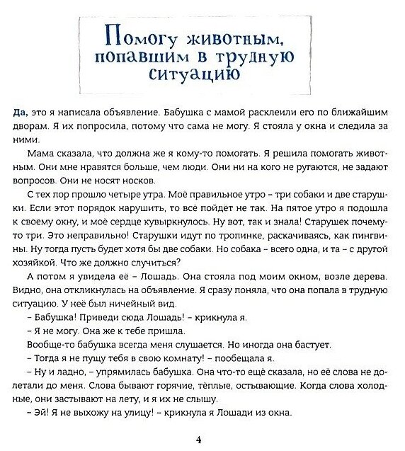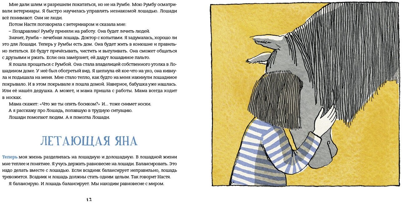 Эта книга просто удивительная!!! Добрая и искренняя, но и очень глубокая. Как шкатулка с двойным дном, полная чудесных вещиц и слов, но чудес настоящих, которые делают реальные люди, дети и взрослые. Очень бережное отношение к любой личности. Здесь и атмосфера цирка с его фокусами, и ламповая атмосфера теплого "лошадиного дома", где лошади болтают между собой, и заботливая веселая семья, и библиотека, готовая принять лошадь, и множество интересных героев . Девочка, которая не любит выходить из дома, решает помочь лошади и найти ей лошадиный дом. А когда она помогает лошади , то понимает, что помогает и людям. Она постоянно встречает детей, которым нужна помощь, чтобы они смогли понять себя. Она приводит их к своему новому другу - директору цирка. Этот директор такая поразительная личность! Он придумывает для детей невероятные профессии, чтобы дети верили в себя и оставались детьми.Персонажи все классные! Девочка, которая укладывает спать обувь, книжный читающий мальчик, который все время что-то находит, мальчик с нельзяйскими правилами, девочка с придуманными призраками. Эта книга просто кишит афоризмами, ее хочется цитировать, очень красивый необыкновенный язык. Одна из фраз написана на обложке. После прочтения книги хочется кому-то помочь и понимаешь , что ты тоже способен сделать чудо. Затрудняюсь сказать, для какого возраста. Героиня сама говорит, что иногда она маленькая, а иногда взрослая, но с ней тогда не играют.Мы читали с детьми 10 и13 лет. И такое интересное ощущение, что книга помогает понять и принять самих себя. Рисунки восторгают, и они такие же волшебные и атмосферные как текст, отлично передают его!