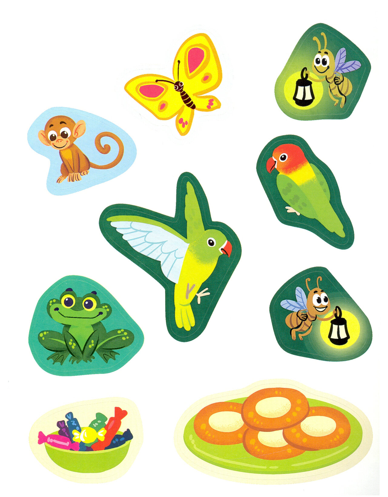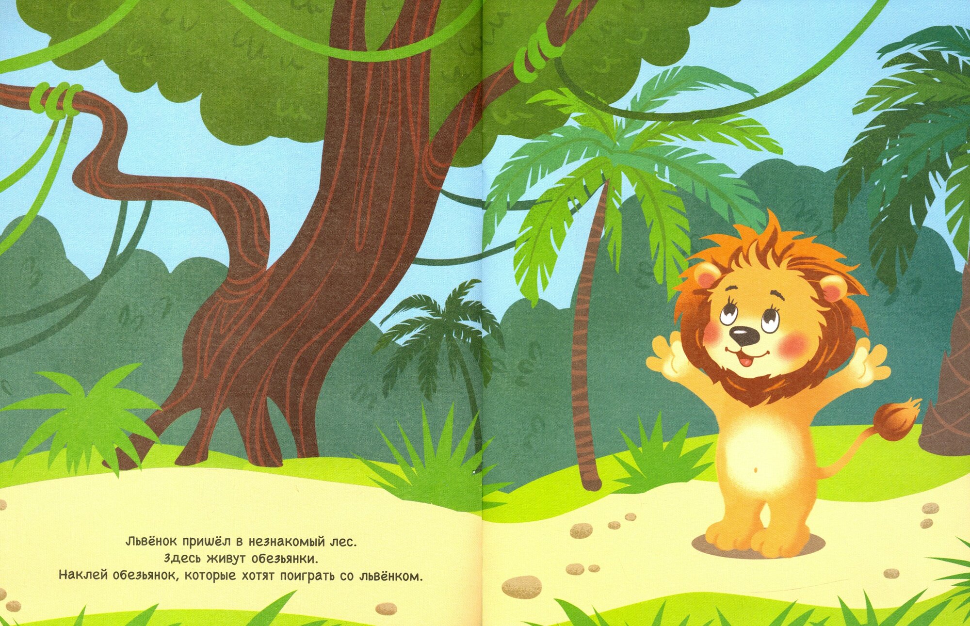В поисках друзей львенок отправился в увлекательное путешествие по лесу и познакомился с забавными зверятами. Порадуй львенка, укрась его приключение яркими наклейками!