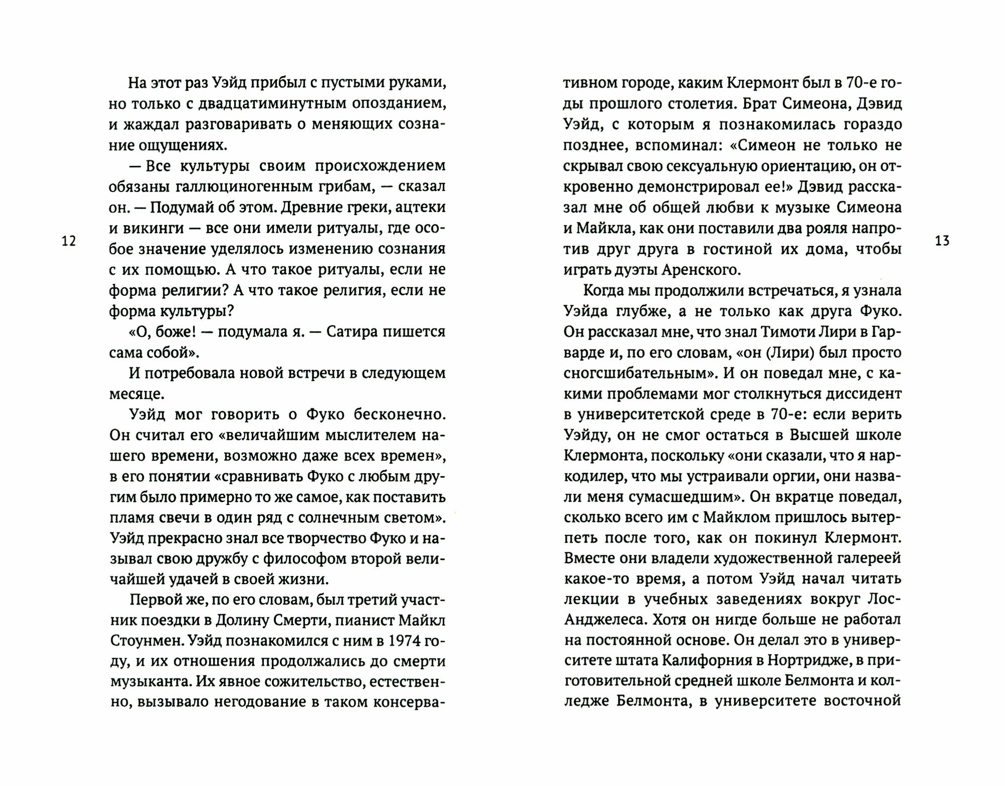 "Фуко в Долине Смерти" - это рассказ Симеона Уэйда о тех длинных выходных. Легкий юмористический слог Уэйда с головой погружает читателя в подрывные круги богемы и интеллигенции Клермонта: здесь и вечеринки в бунгало Уэйда, и насыщенные диалоги между Фуко и его учениками в даосской утопии в лесу Лос-Анджелеса, и, конечно же, легендарный трип в Долине Смерти. Эта книга-о дружбе молодого человека с одним из величайших мыслителей XX века, расцветающей среди отчаянной вакханалии и утонченных бесед о поиске высшего сознания.