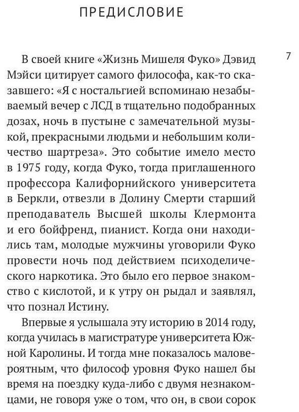 Это произошло в 1975 году, когда Мишель Фуко провел выходные в Южной Калифорнии по приглашению Симеона Уэйда. Фуко - одна из ярчайших звезд философии XX века - в тот момент находился в зените своей славы. Прочитав лекцию аспирантам местного колледжа, он согласился отправиться в одно из самых запоминающихся путешествий в своей жизни. Вместе с Уэйдом и его другом Фуко впервые экспериментировал с психотропными веществами; к утру он плакал и говорил, что познал истину.