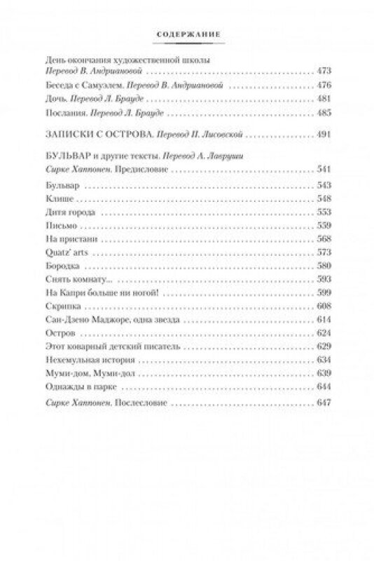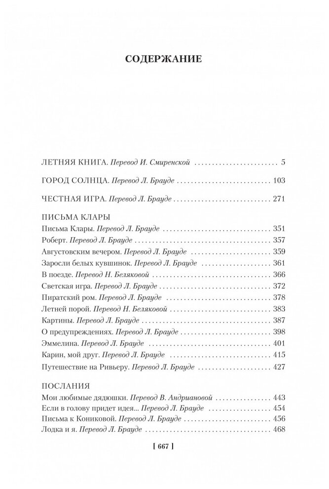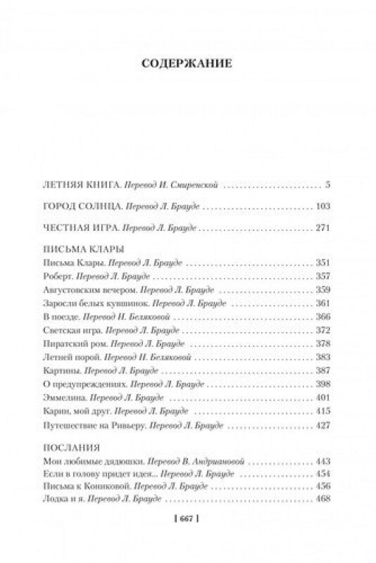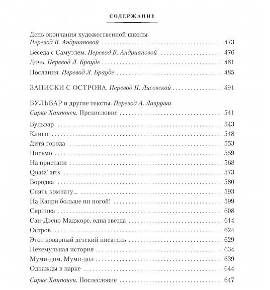 В эту книгу, помимо единственного написанного Туве Янссон романа «Город солнца» о безмятежной старости на побережье и пронзительной повести «Летняя книга» о девочке, потерявшей мать, а также уже известных русскому читателю рассказов и новелл, вошли и впервые переведенные на русский язык произведения. Северная атмосфера дневниковых «Записок с острова», посвященных строительству дома на Кловхаруне и жизни там, создает эффект присутствия на острове, пронизанном ветрами Финского залива и наполненном криками чаек, бесцеремонно вторгающихся в быт поселенцев. А под общим заголовком «Бульвар и другие тексты» кроется ряд ранних новелл и эссе Янссон, опубликованных в периодических изданиях в разные годы ее творческой деятельности. В них Туве рассказывает, каково быть детским писателем, размышляет о живописи и критикует архитектуру, делающую человека несчастным.
