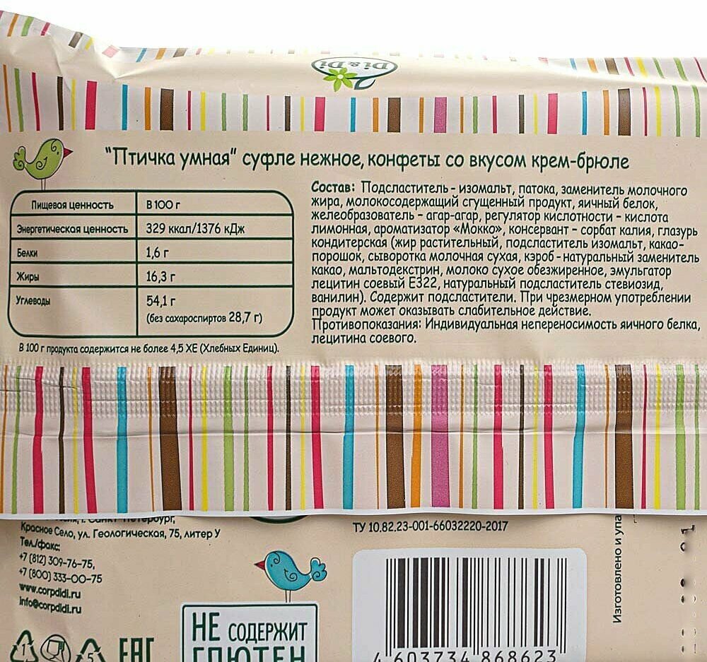 Лимонное суфле «Птичка умная» в глазури порадует Вас нежным и освежающим вкусом. Воздушное суфле не содержит сахар и фруктозу, поэтому станет отличным лакомством для сладкоежек, которые следят за своим здоровьем и фигурой. В составе «Птички умной» содержатся натуральные сахарозаменители – стевия и изомальт. Стевия низкокалорийная, но при этом слаще сахара в 200 раз, и обладает богатым химическим составом, что благотворно влияет на организм. Она нормализует метаболизм, улучшает состояние кожи и иммунной системы. Изомальт обеспечивает прилив сил, укрепляет микрофлору желудка и снижает аппетит, продлевая чувство сытости. С «Умными сладостями» вам не придется отказываться от сладкого. Худейте и получайте удовольствие вместе с нашими конфетами. При чрезмерном употреблении продукт может оказывать слабительное действие. Противопоказания: индивидуальная непереносимость яичного белка, лецитина соевого. Состав глазури: жир растительный, подсластитель изомальт, какао порошок, сыворотка сухая молочная, кэроб - натуральный заменитель какао, мальтодекстрин, молоко сухое обезжиренное, эмульгатор лецитин соевый, натуральный подсластитель ствиозид, ванилин. Попробуйте также суфле «Птичка умная», конфеты со вкусом крем-брюле. Полезное лакомство, сладости без сахара и глютена, диета, кето-диета, диабетические сладости. Правильное решение для здорового перекуса, в детский сад, в школу, на работу, прогулку, любой праздник - на 8 марта, 23 февраля, на день учителя, новый год для девочки, мальчика, маме, для детей, коллеге, бабушке, дедушке, любимой вкусные подарки. В ассортименте «Умные сладости» конфеты, мармелад без сахара, суфле, зефир, шоколад, пастила. Правильное питание, пп, Десерт, сладкие вкусняшки, продукты питания без глютена и без фруктозы. Еда, зож, веган, новогодние, для диабетиков, жевательные конфеты, вкусный подарок, без сахара и глютена, эко, натуральные, необычные живые конфеты, упаковка, польза, диетические продукты, шоколад без сахара.