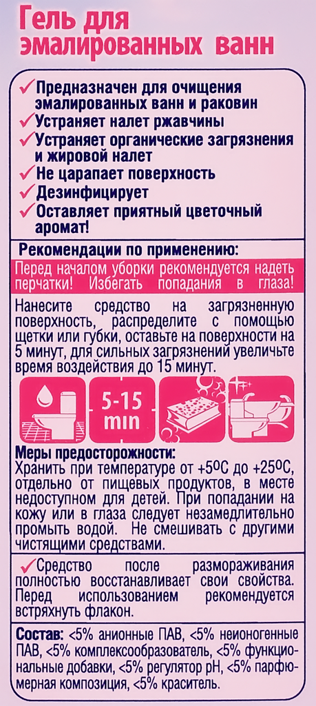 Средство для быстрого и эффективного очищения эмалированных поверхностей от загрязнений и ржавчины. Благодаря эффективному составу справляется с трудными загрязнениями. Подходит для: эмалированных ванн и раковин, покрытых некислотостойкой эмалью.Не содержит абразивных добавок и не царапает поверхность.Не повреждает эмаль.Быстро удаляет ржавчину.Устраняет органические загрязнения и жировой налет.Дезинфицирует.Легкий цветочный аромат сделает приятной уборку!Равномерно нанесите средство на очищаемую поверхность, оставьте на короткое время для воздействия и смойте водой. Для более эффективной очистки трудновыводимых загрязнений увеличьте время нахождения средства на поверхности, почистите щеткой и смойте водой. Плотно закрывайте флакон после применения.При работе со средством обязательно использование перчаток!Гель расходуется экономично, поэтому его хватит на долгое время.Уважаемые клиенты! Обращаем ваше внимание на то, что упаковка может иметь несколько видов дизайна. Поставка осуществляется в зависимости от наличия на складе.