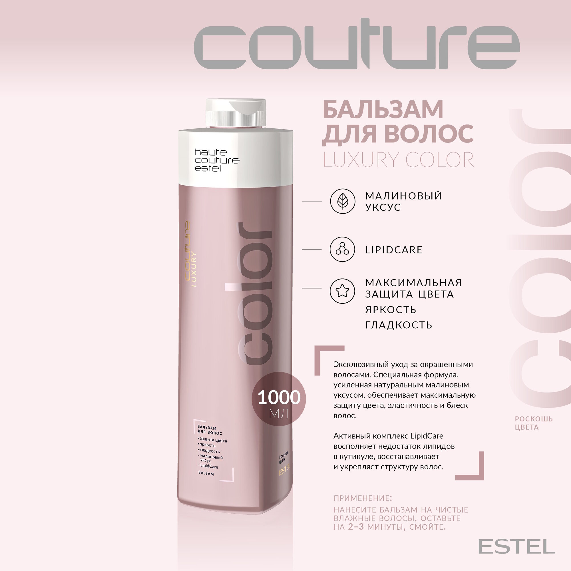 Бальзам для окрашенных волос укрепляет структуру за счёт уникального комплекса LipidCare и закрепляет цвет благодаря натуральному малиновому уксусу.