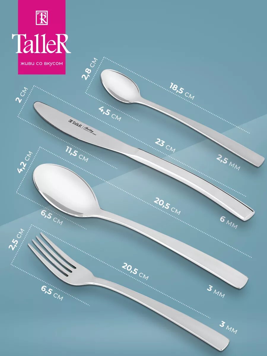 Состав набора: ложки столовые — 6 шт., ложки чайные — 6 шт., вилки — 6 шт., ножи столовые — 6 шт.