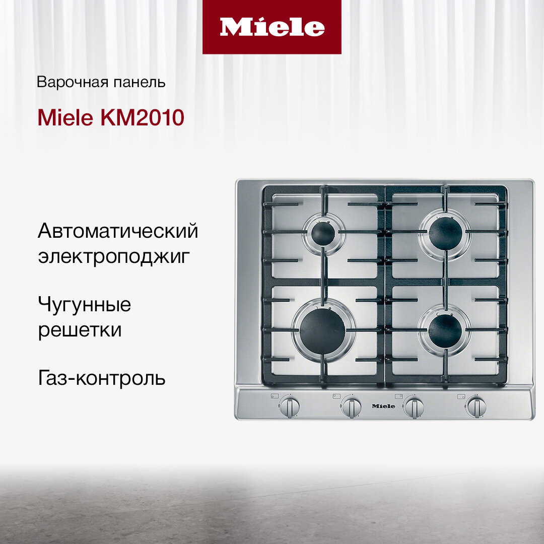Газовая варочная панель Miele КМ 2010 Ширина 65 см, 4 газовые конфорки. Поворотные переключатели из пластика с металлическим покрытием. Поверхность из высококачественной нержавеющей стали. Чугунные решетки, покрытые чёрной матовой эмалью. Автоматический электроподжиг, газ-контроль.