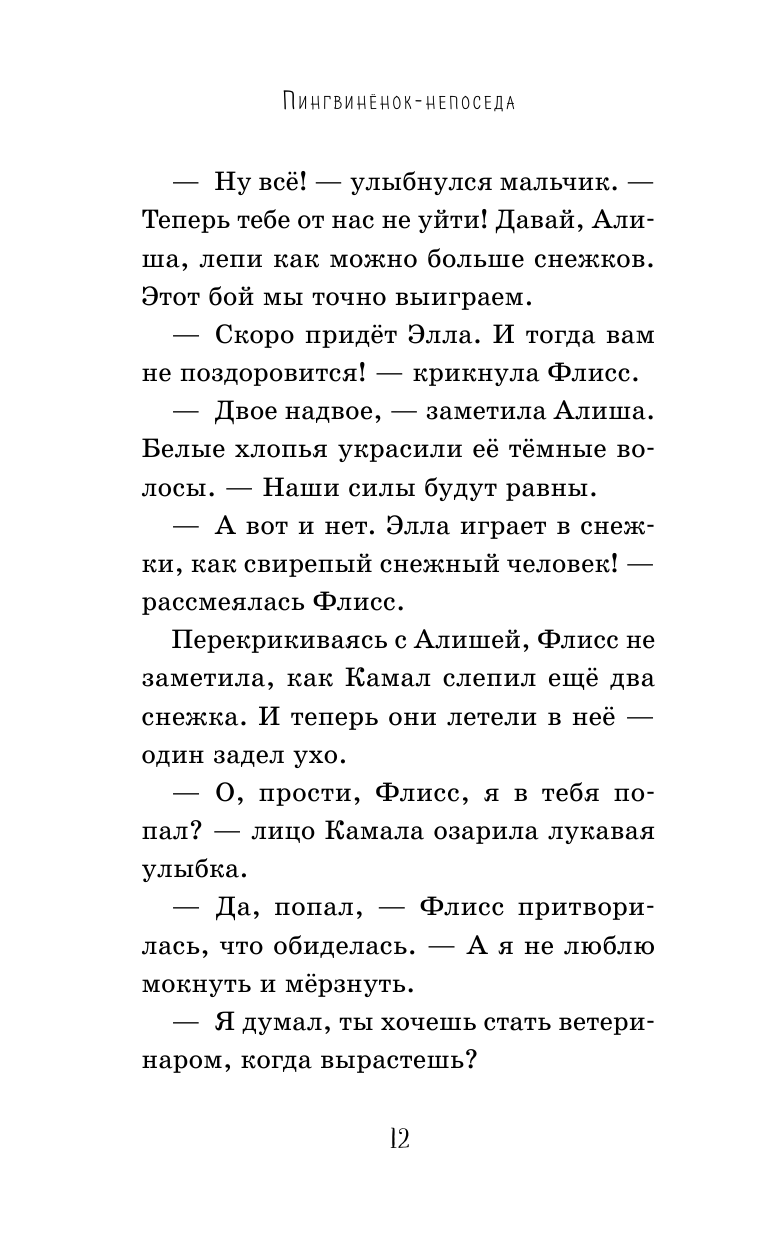 Книга сыну, 9лет, очень понравилась. Прочитал всю сам с большим удовольствием. Очень проникся историей о пингвинёнке. Пришёл и рассказал мне приключения про маленького пингвина и девочку Флис. И ничего, что там немного иллюстраций и они некрасочные. Сам текст написан доступным языком, легко читается. Я не читала, но то, что сын читал так увлечённо можно сказать, что сюжет его захватил, "зацепил".