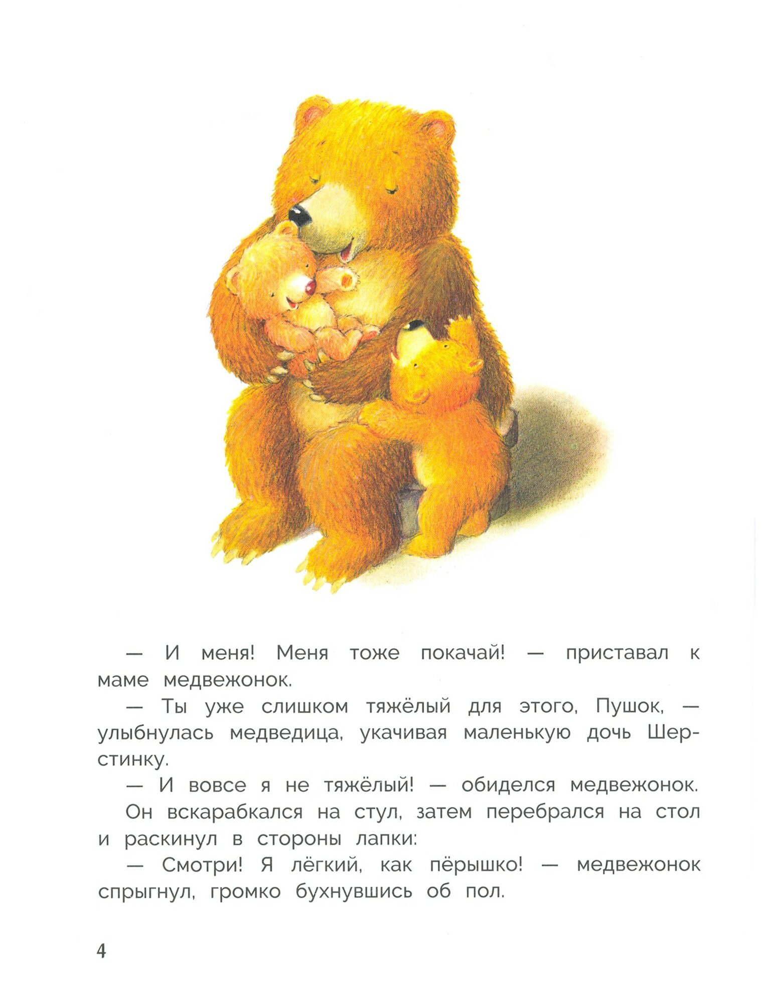 Когда в семье появилась младшая дочь, конечно, у старшего сына появилась и ревность, и агрессия к ней, борьба за мамино внимание. Случайно увидела эту книгу, в ней истории в точности совпадают с нами, решила взять своему трехлетке. Сначала мне показалось, что в книге ничего особенного, но ребенку она очень понравилась, постоянно просит ее перечитать, хотя истории там не самые маленькие. Радует, что в книге истории добрые и с хорошей понятной моралью, с адекватной реакцией родителей-медведей на проступки медвежат. Прямо то, что я искала. Вдобавок очень милые цветные картинки)