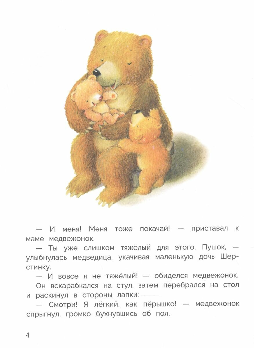 Забавные и очень трогательные истории про медвежонка Пушка и его маленькую сестричку Шерстинку, поведают юным читателям о том, почему важно заботиться о младших и слушаться старших. В книге просто и понятно раскрываются такие важные темы, как взаимоотношения между старшими и младшими детьми, ревность, дружба, любовь и ответственность. А замечательные красочные иллюстрации сделают сказки не только поучительными, но и увлекательными.