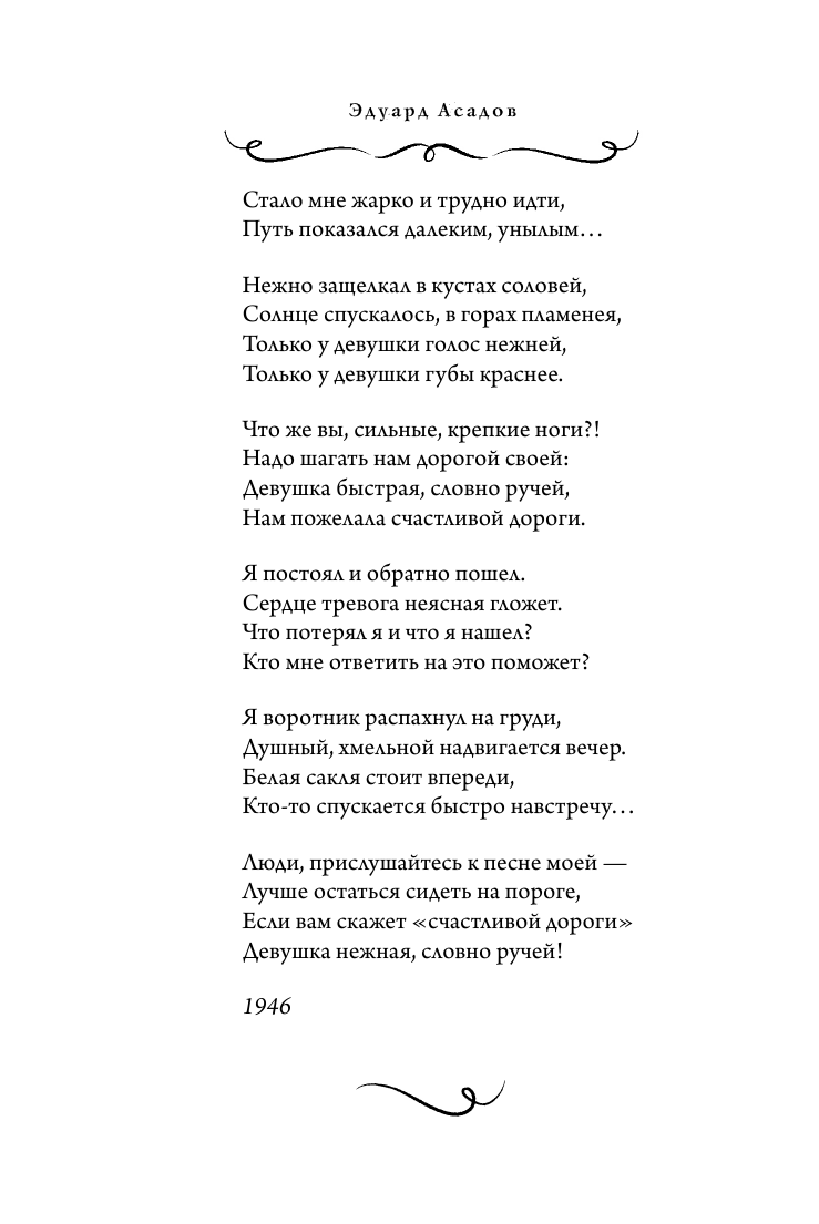 Обожаю творчество Эдуарда Асадова. В книге вы встретите произведения обо всём: о любви, о дружбе, о войне, о природе, о боли, разочаровании, о различных житейских ситуациях. Думаю каждый найдёт себе произведение по душе.