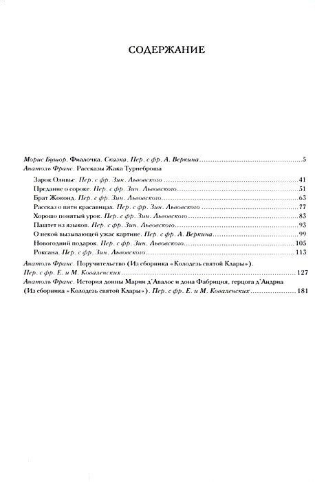В данное издание включены избранные новеллы из сборника Анатоля Франса «Колодезь святой Клары» и сатирические «Рассказы Жака Турнеброша», а также сказка Мориса Бушора о красавице Фиа-лочке, нежной девушке, которая покорила сердце не только благородного Робера, но и злодея по прозвищу Кривой Нос.