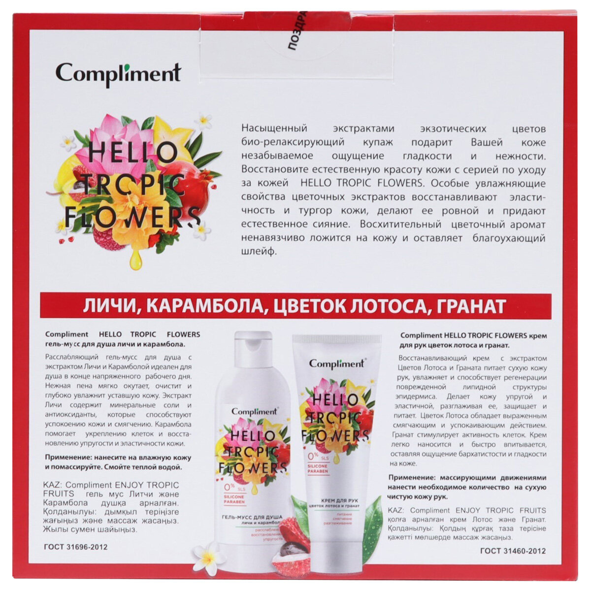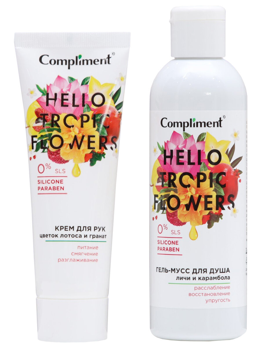 | Состав набора | compliment hello tropic flowers гель-мусс для душа личи и карамбола, 200мл; compliment hello tropic flowers крем для рук цветок лотоса и гранат, 80мл |