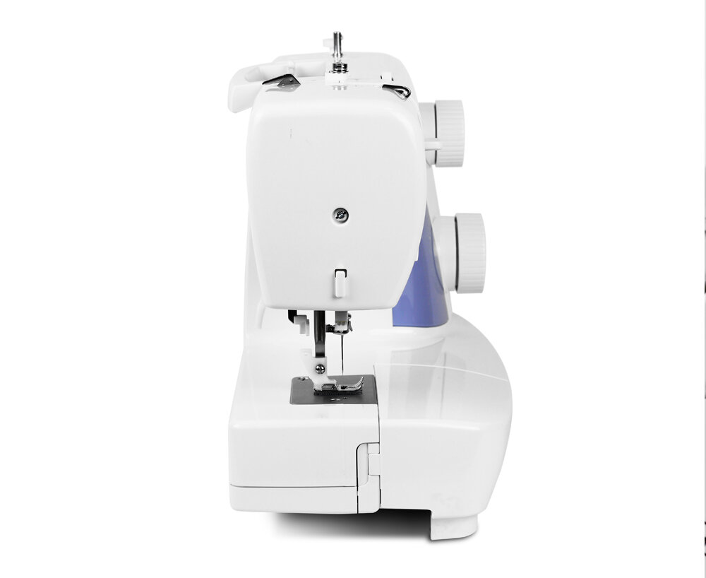 Машина имеет металлическую станину, но отличается небольшим весом и размером. Она подойдет для шитья и ремонта одежды дома, обучения шитью и любых небольших обработок материалов.