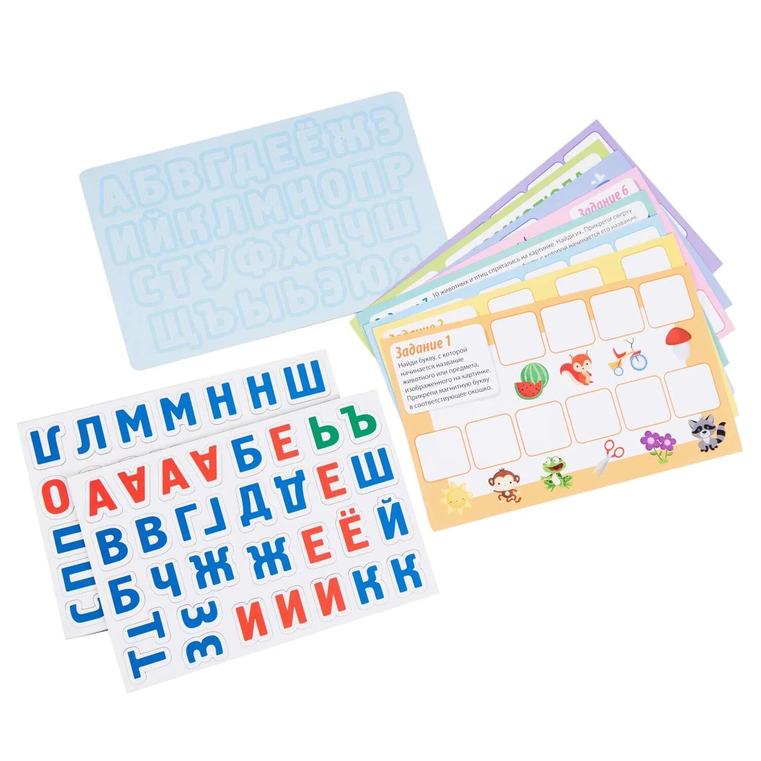 Магнитная азбука, с помощью которой можно выучить буквы в игровой форме, выполнять задания и играть. На голубой стороне магнитного поля силуэты букв для запоминания правильного порядка в алфавите. На зеленой стороне можно составлять слоги и слова из магнитных букв.