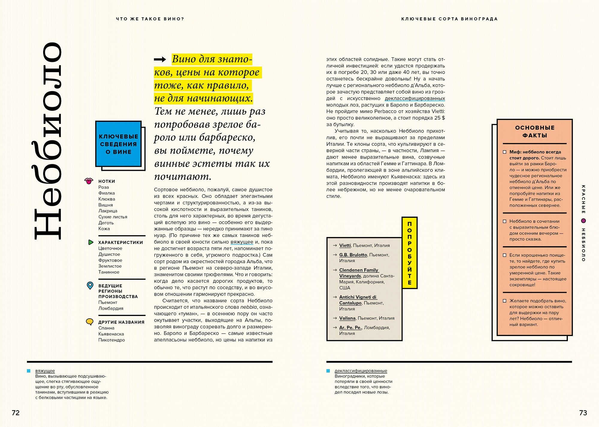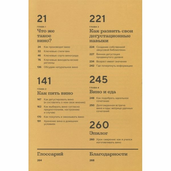 Отличное книжное издание от ведущего сомелье Нью-Йорка. Пестрые векторные иллюстрации не уступают информации, заложенной в данной книге: апеласьоны, сорта винограда, технологии сборки и выдержки винного материала, а также гастрономические сочетанию с алкоголем. Однозначно рекомендую к покупке.