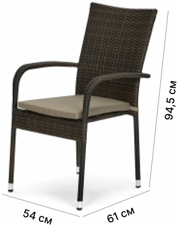 Садовый стул с подлокотниками выведет отдых в саду или на террасе на новый уровень комфорта. Рама изделия изготовлена из высокопрочной стали, а внешние элементы сплетены из искусственного ротанга — материала, устойчивого к влаге, выгоранию, механическим воздействиям. Стул может постоянно эксплуатироваться на открытом воздухе. На ночь его необязательно заносить в дом: ему не страшен дождь и ветер. Чтобы привести изделие в первозданный вид, достаточно протереть поверхность мягкой тканью. В комплекте съемная полиэстеровая подушка, которая легко закрепляется на спинке изделия и так же легко снимается.