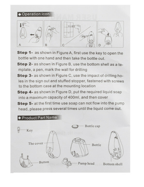 Механический дозатор для жидкого мыла предназначен для установки в любых санитарно-гигиенических комнатах. Имеет ключ и пластиковый замок. Дозатор прост в эксплуатации, достаточно нажать на кнопку для получения порции средства. Для удобства контроля за уровнем мыла на лицевой поверхности есть смотровое окно в виде капли. Корпус диспенсера изготовлен из прочного пластика АБС серого цвета, который выдерживает различные механическое воздействие. В резервуар емкостью 400 мл можно заливать как жидкое мыло, так и прочие средства. Разместив диспенсер на стене, достаточно время от времени проверять заполненность резервуара. Иного ухода он не требует, не нуждается в замене батареек. Это отличное решение как для частных владений, так и для гостиниц, кафе, столовых и прочих общественных мест. Габаритные размеры: высота 190 мм, ширина 110 мм, глубина 90 мм. Вес - 0,340 кг.