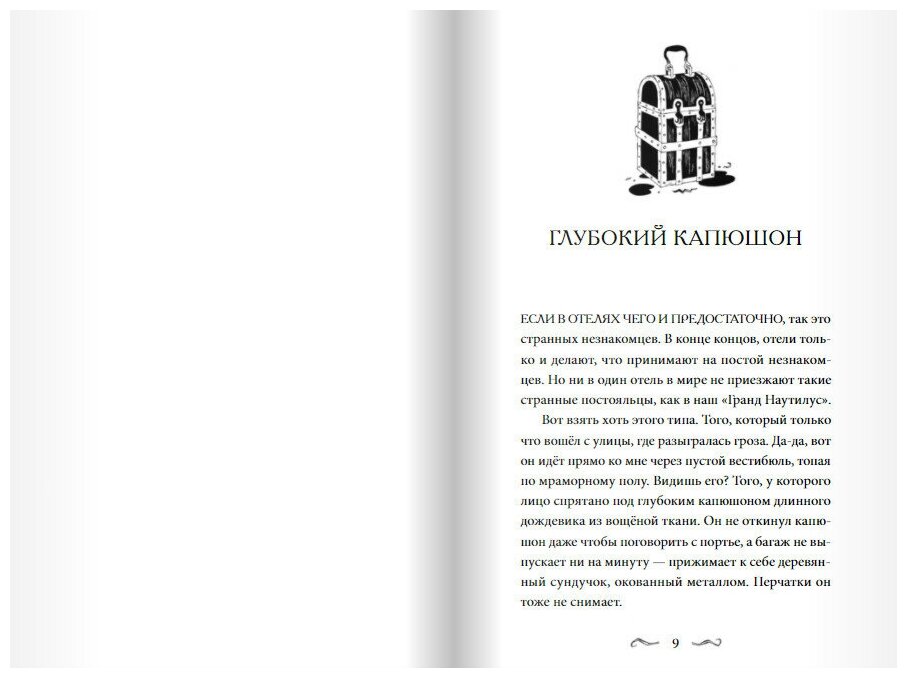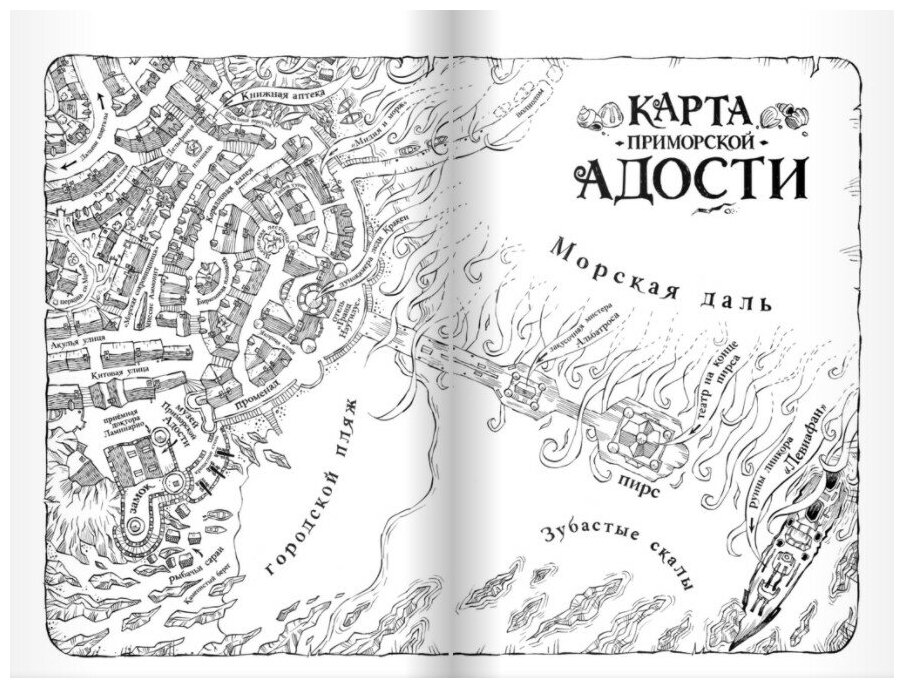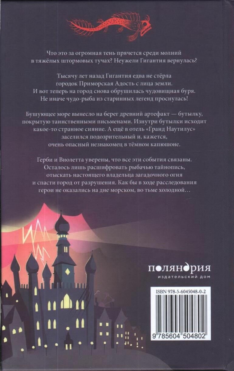 Герберт из отельного бюро находок и его подруга Виолетта получают на хранение старинную бутылку, выброшенную на берег штормом небывалой силы. На бутылку претендует нашедшая её жительница города, глава музея города, странный постоялец Капюшон, который подкинул в бюро механического краба-крушителя, и группа рыбаков. Главные герои берутся установить истинного хозяина бутылки. Это второй том из цикла книг о Приморской Адости. Детям, прочитавшим Гарри Поттера 1-5 тома, будет думаю интересно. Второй том кстати толще первого. Что могу отметить: лихо закрученный сюжет с крутыми и неожиданными поворотами, приятный юмор и работу переводчика и редактора. Её ОЧЕНЬ приятно читать из-за богатого языка повествования. Я, например, давно в современных книгах не встречала слово «потешный». Сам текст печатается с буквой ё, что тоже приятно. Из конструкции мира Приморской Адости отмечу её легкость. Она продумана и представлена как данность. Автор не пытается объяснить с точки зрения реальной оптики устройство луноскопа. Не пытается определить биологический вид гигантии. Это очень облегчает мне понимание мира Адости. Иллюстрации представлены виньетками в начале и в конце каждой главы