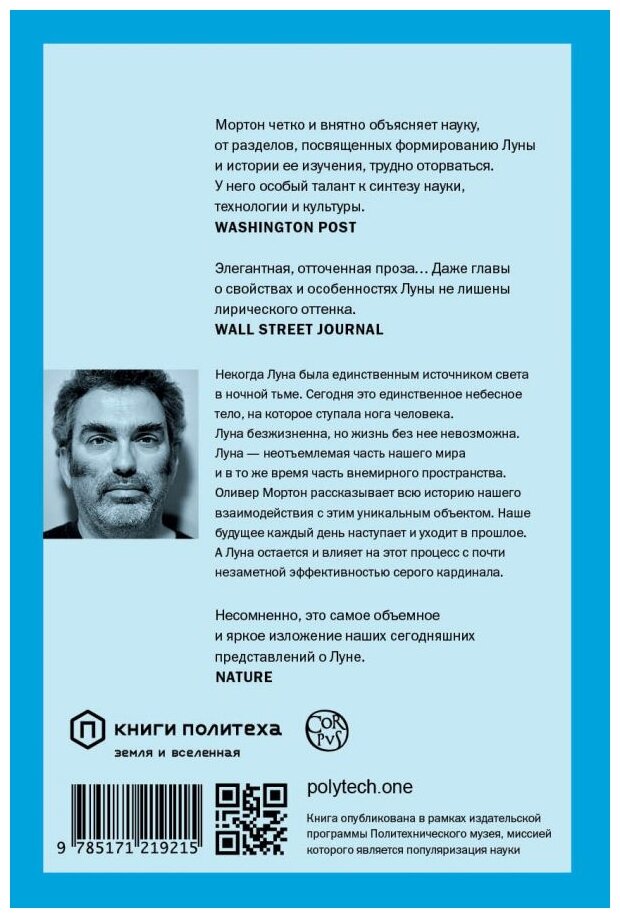 Британский журналист и писатель Оливер Мортон освещает в своих работах влияние научно-технического прогресса на нашу жизнь. Луна испокон веков занимала второстепенное место в мифологическом сознании, в культурном контексте, а потом и в астрономических исследованиях. Краткий апогей ее славы, когда по лунной поверхности прошлись люди, окончился более полувека назад. И тем не менее Луна всегда рядом, скромная, но незаменимая, неразрывно связанная с прошлым, настоящим и будущим человечества. Мортон создает ее объемный портрет, прорисовывает все грани нашего с ней взаимодействия и наглядно показывает: что бы ни происходило с нами дальше, Луна продолжит играть свою тихую, но ключевую роль.