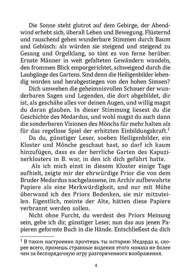 Эрнст Теодор Амадей Гофман — писатель-романтик, сказочник, композитор, художник. В его произведениях переплетаются реальность и фантастика, а скучная обыденность показывается через сферу высоких чувств и музыку Вселенной. В романе «Эликсир дьявола» поднимается тема греха и добродетели. Искушение наполняет душу ядом, сводит с ума, толкает в пучину страстей. Можно ли прервать это падение? Как сглад ить противоречия между идеалом и действительностью? Как примирить необузданные желания и разум? Гофман впускает читателей в мир, наполненный сплошными условностями. Им предстоит самим найти ответы на все эти вопросы. «Эликсир дьявола» — это произведение, которое не теряет своего очарования даже сейчас, когда с момента первой публикации прошло уже больше двух веков. Своеобразная мистическая атмосфера книги, граничащая с глубоким психологизмом, ощущается очень современно. Чтение романа в оригинале позволит прочувствовать уникальность готического стиля и углубить знания немецкого языка.