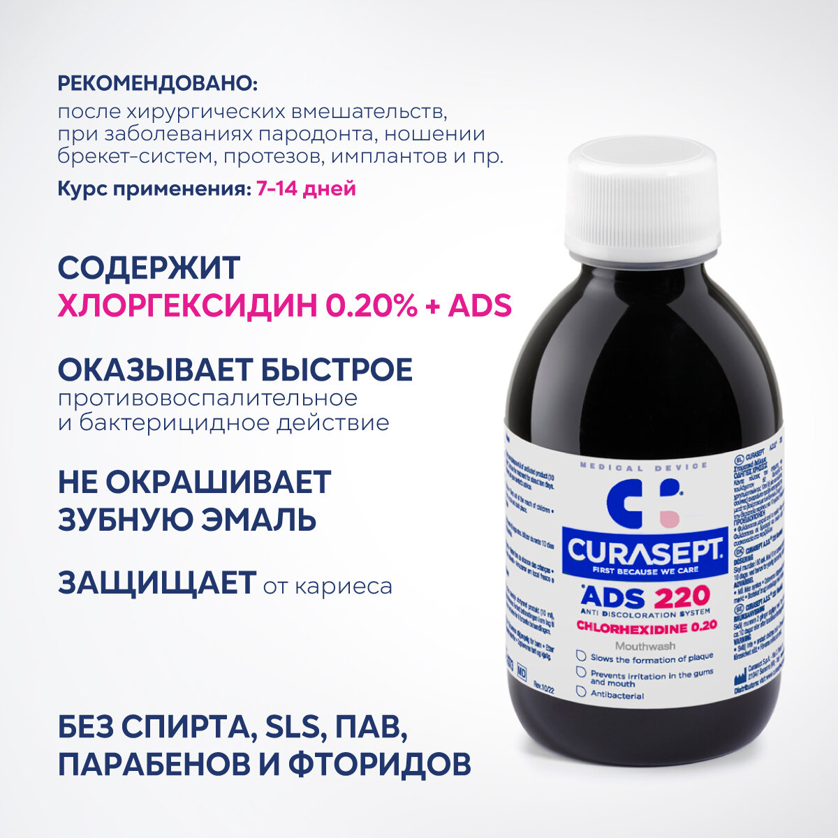 | Состав набора | Curasept ADS 220 ополаскиватель 0,20 хлоргексидин |