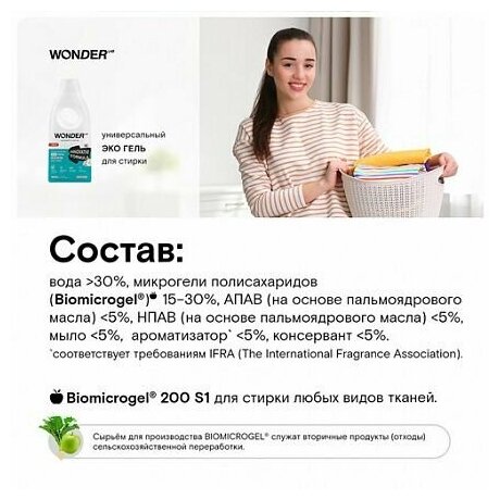 Гель для стирки WONDER LAB с нежным ароматом утренних цветов в новом литровом объеме по более доступной цене. Гель подходит для всех типов ткани . Идеален для вещей, которые приходится часто стирать. Средства для стирки WONDER LAB сохраняют свою эффективность при температуре от 30 до 90 градусов. Подходит для ручной и машинной стирки. Гель для стирки не требует использования кондиционеров, сохраняя мягкость белья надолго. Легкий аромат практически не остается на одежде, благодаря чему средство для стирки отлично подойдет аллергикам и чувствительным к лишним запахам людям. Средство полностью выполаскивается, не оседая в волокнах ткани, благодаря чему вещи не грубеют и не деформируются. Гель для стирки не содержит фосфатов и фосфонатов. В составе только безопасные ПАВ на основе кокосового масла и с содержанием менее 5%, благодаря чему экосредства не вредят водоёмам.