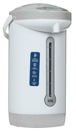 Модель оснащена двумя температурными режимами: кипячение и поддержание температуры. Благодаря этому можно выбрать оптимальный вариант для чая, кофе или детского питания. Корпус выполнен из качественного пластика, который отличается высокой прочностью и устойчивостью к механическим повреждениям. Дополнительные технические параметры: