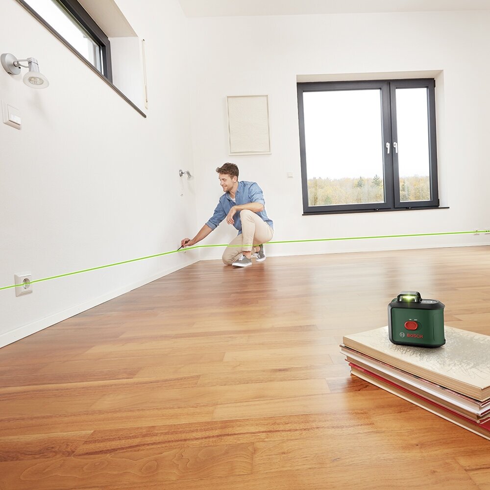 Universal Level 360, обеспечивающий превосходную видимость для высокоточного выравнивания по всему помещению, является образцом инструмента, сочетающего в себе точность, универсальность и удобство использования. Самонивелирующаяся проекция горизонтального лазерного луча на 360° и вертикального луча на 120° обеспечивает удобное и быстрое выравнивание, а технология зеленого лазера обеспечивает лучшую видимость для комфортной работы даже при ярком освещении. Необходимо выровнять по высоте подвесные потолки или карнизы? Требуется выровнять предметы, такие как полки и картины по заданному ориентиру? Или предстоит фигурная укладка плитки? Продолжайте работу и дайте волю своей креативности с функцией наклона, позволяющей работать с диагональными линиями.