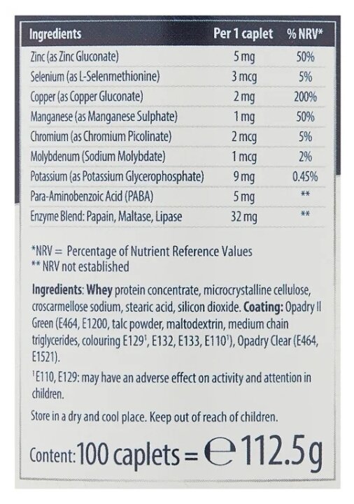 Состав: кальция карбонат, белок молочной сыворотки, L-аскорбиновая кислота, магния оксид, D-альфа-токоферола сукцинат, носитель: E460, стабилизатор: E468, ниацинамид, стабилизатор: E340, железа фумарат, меди глюконат, цинка глюконат, носитель: E570, D-кальция пантотенат, папаин, диастаза, липаза, агент антислеживающий: E551, пара-амино бензойная кислота, матрица холекальциферола (мальтодекстрин, холекальциферол), бета-каротин, марганца сульфат, пиридоксина гидрохлорид, тиамина мононитрат, рибофлавин, L-селенметионин, фолиевая кислота, калий йодид, фитоменадион, хрома пиколинат, D-биотин, метилкобаламин, натрия молибдат, покрытие (стабилизатор: E1400, среднецепочечные триглицериды, глазирующий агент: E1521, стабилизатор: E1200, загуститель: E464,агент антислеживающий: E553 iii; красители: E132, E110, E133, E129). Содержит красители, которые могут оказывать отрицательное влияние на активность и внимание детей