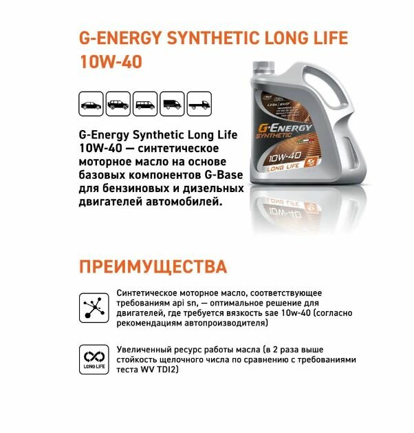 G-Energy Synthetic Long Life 10W-40 – синтетическое моторное масло на основе базовых компонентов G-Base для бензиновых и дизельных двигателей автомобилей. Благодаря надёжной защите деталей от износа и низкому расходу на угар позволяет увеличить интервалы между заменами масла.