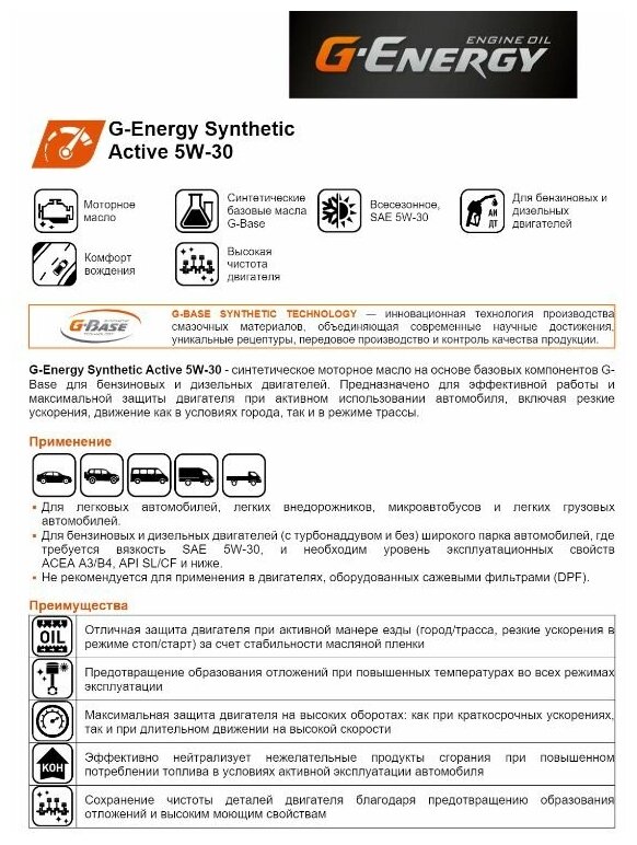 G-Energy Synthetic Active 5W-30 - синтетическое моторное масло на основе базовых компонентов GBase для бензиновых и дизельных двигателей. Предназначено для эффективной работы и максимальной защиты двигателя при активном использовании автомобиля, включая резкие ускорения, движение как в условиях города, так и в режиме трассы.