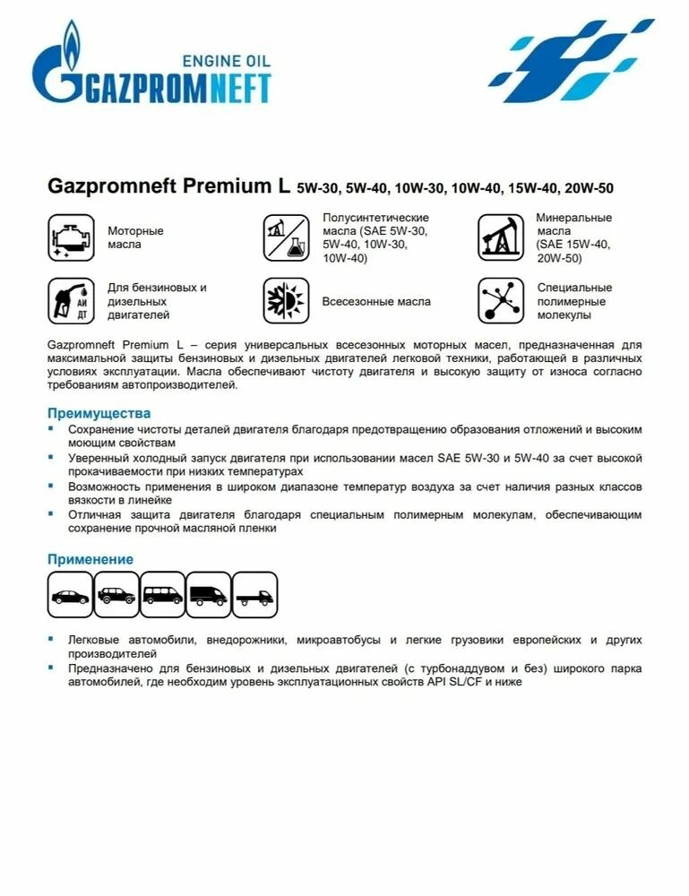 Gazpromneft Premium L 10W-40 - универсальное всесезонное полусинтетическое моторное масло, предназначенное для максимальной защиты бензиновых и дизельных двигателей легковой техники, работающее в различных условиях эксплуатации. Масло обеспечивает чистоту двигателя и высокую защиту от износа.