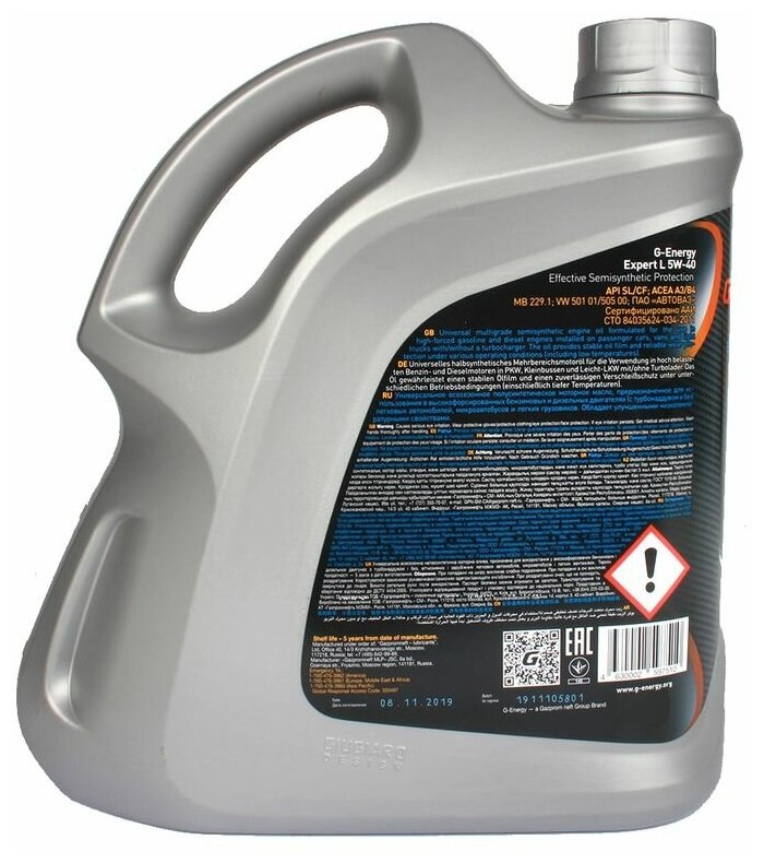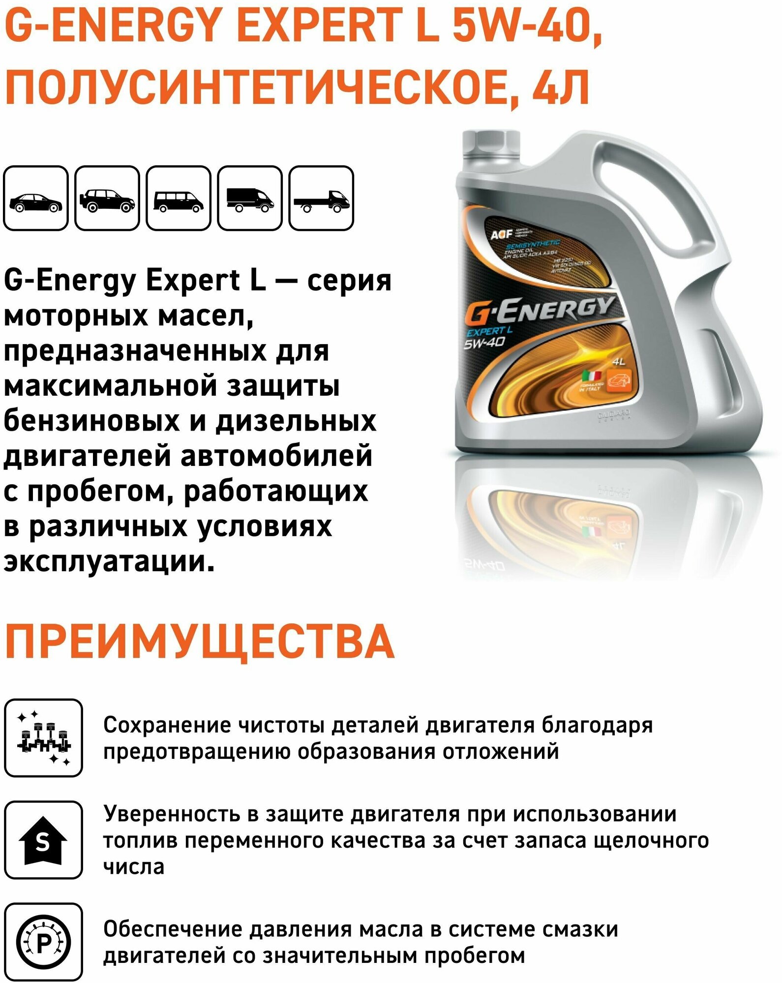 G-Energy Expert L 5W-40 — моторное масло, предназначенное для максимальной защиты бензиновых и дизельных двигателей автомобилей с пробегом, работающих в различных условиях эксплуатации. Поддерживает давление в системе смазки, обеспечивает надежную работу двигателя с пробегом.