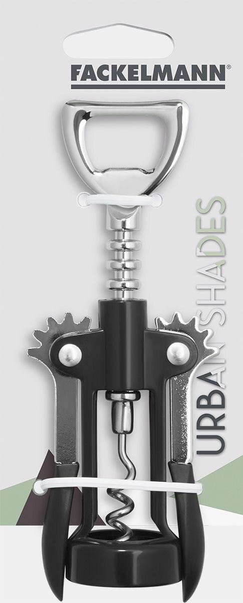 Штопор с рычагами изготовлен из хромированного цинкового сплава и пластика. Использовать штопор легко – просто вкрутите штопор в пробку с помощью держателя-кольца (при этом рычаги поднимутся вверх), а затем вытащите пробку, опустив рычаги штопора вниз. Держателем –кольцом также можно воспользоваться для открывания пробок типа прижимных – поместите кольцо штопора под ободок пробки и потяните с усилием вверх, пробка изогнется и поднимется, таким образом откупорив бутылку. Этот штопор идеально сочетается с продуктами серии Fackelmann Urban Shades