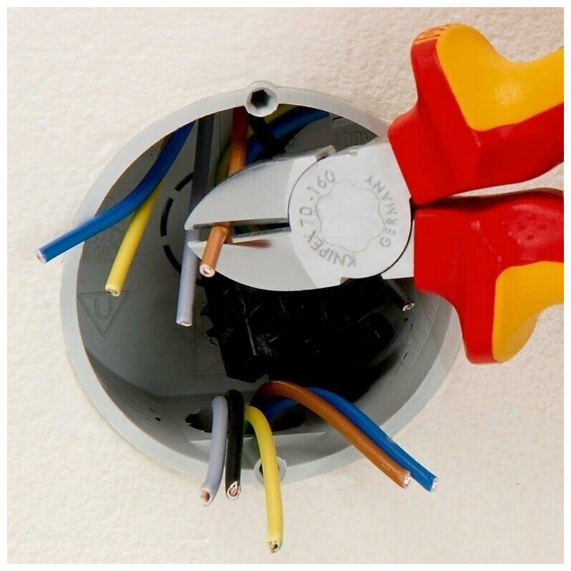 Бокорезы KNIPEX применяются для резания проволоки разной степени твердости. Данный инструмент изготовлен из ванадиевой электростали, которая закалена в масле, что обеспечивает высокую прочность, надежность и длительный срок службы. Рукоятки бокорезов снабжены специальными двухкомпонентными чехлами для исключения скольжения и защиты рук оператора во время работы. Режущие кромки инструмента дополнительно закалены ТВЧ до твердости 62 НRC и обеспечивают чистый рез даже тонкой проволоки. Поставляется в блистерной упаковке.Особенности: Работа в труднодоступных местахГоловка бокорезов KNIPEX имеет удлиненную форму для более удобной работы в труднодоступных местах. Режущие кромки инструмента дополнительно закалены ТВЧ до твердости 62 НRC и обеспечивают чистый рез даже тонкой проволоки. БезопасностьРукоятки инструмента снабжены специальными двухкомпонентными чехлами для исключения скольжения и защиты рук оператора во время работы.Преимущества:- Малый вес - 0.216 кг снижает энергоемкость работы;- Длительный срок эксплуатации достигается закалкой кованой ванадиевой электростали, используемой при изготовлении инструмента и прецизионной обработкой;- Возможность работы с мягкой проволокой диаметром до 4 мм, твердой проволокой диаметром до 2 мм и проволокой средней твердости диаметром до 2.8 мм;- Данный инструмент испытан на соответствие нормам VDE;- Механические узлы бокорезов соответствует Закону о безопасности техники и продукции (GPSG);- Возможно использование инструмента для электротехнических работ с переменными токами напряжением до 1000 В и с постоянными токами напряжением до 1500 В;- Хромированная головка обеспечивает более высокую точность работы;- Длина бокорезов составляет всего 160 мм, что упрощает их хранение и транспортировку.
