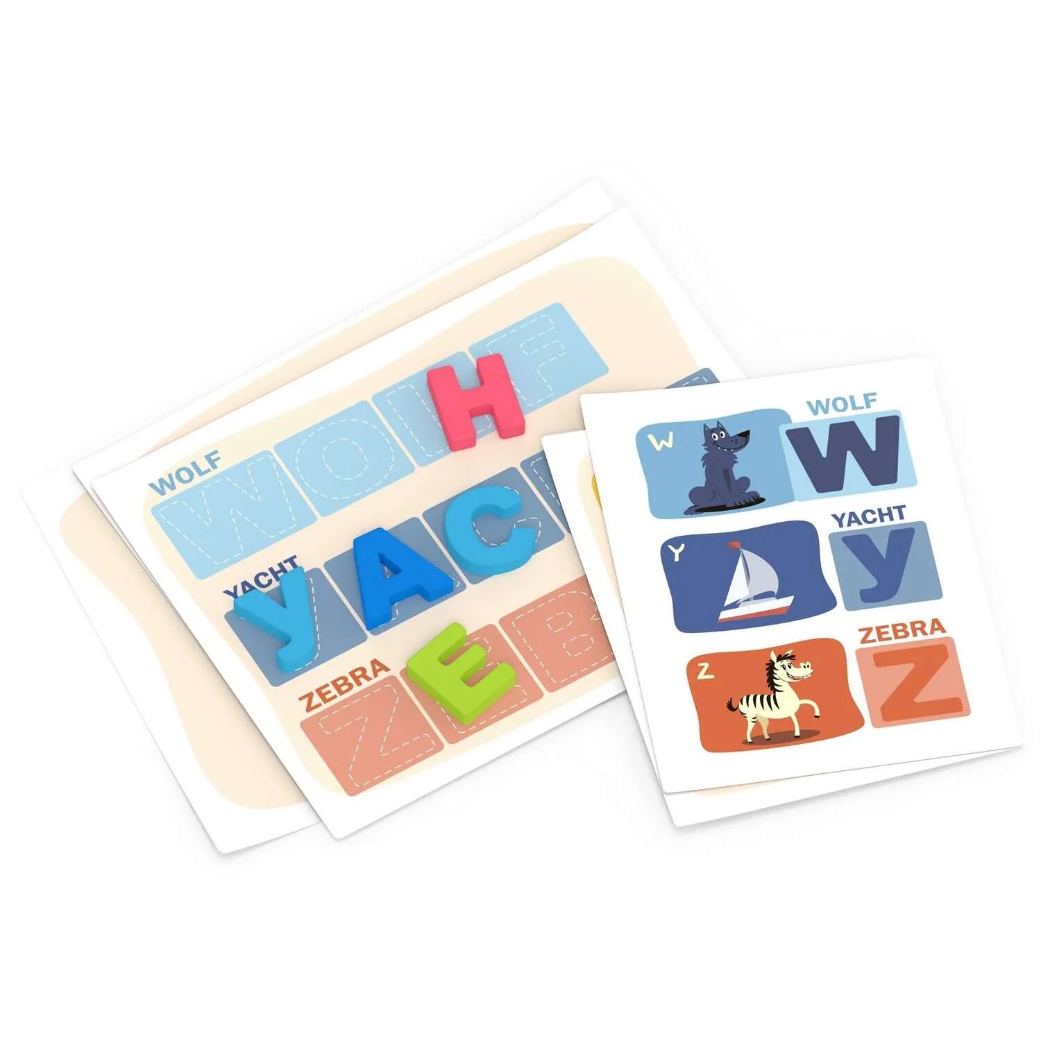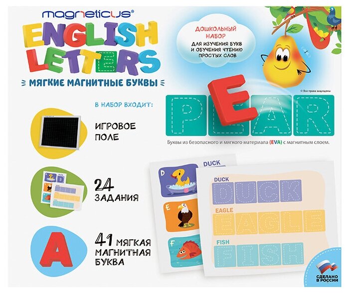 Предложите вашему ребенку, не дожидаясь школы, начать изучение английского языка с помощью мягких магнитных букв из этого набора. Крохе предстоит составлять из них простые слова, выполняя задания с карточек, что станет прекрасным вариантом обучения для пополнения словарного запаса и расширения кругозора.Особенности:- Составляющие этого набора превратят изучение английского языка в увлекательную игру, по правилам которой дети будут решать веселые задачки.- В процессе выполнения заданий юные полиглоты запомнят алфавит, научатся считать, читать и пополнят свой словарный запас.- А, чтобы занятия были еще интереснее для крохи, все буквы дополнены магнитными основаниями, поэтому легко крепятся к металлическому игровому полю или дверце холодильника.- Задания подразумевают составление слов из отдельных букв, дополнение недостающими или сопоставление картинки с названием на английском языке.- Хранить магнитные элементы и задания очень удобно в металлической коробке, также она позволит взять набор с собой в поездку.- Благодаря обучающему комплекту дети быстрее выучат английский язык и пополнят свой словарный запас многочисленными новыми понятиями.- Буквы выполнены из мягкого сертифицированного полимера, поэтому идеально подойдут для первых занятий с будущим полиглотом.В комплекте: 24 задания, 41 мягкая буква, игровое поле металлическое, коробка металлическая.