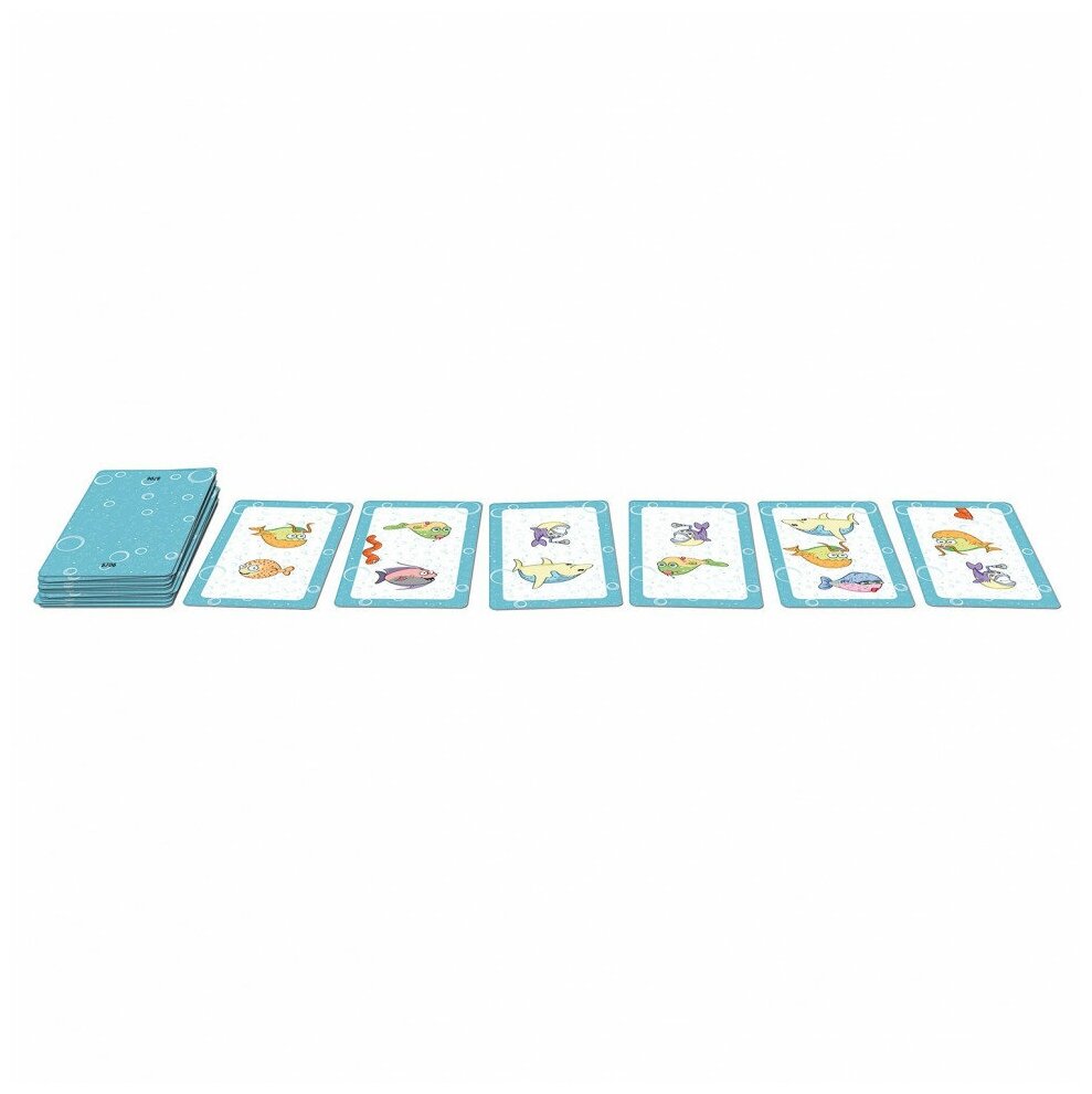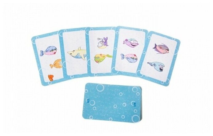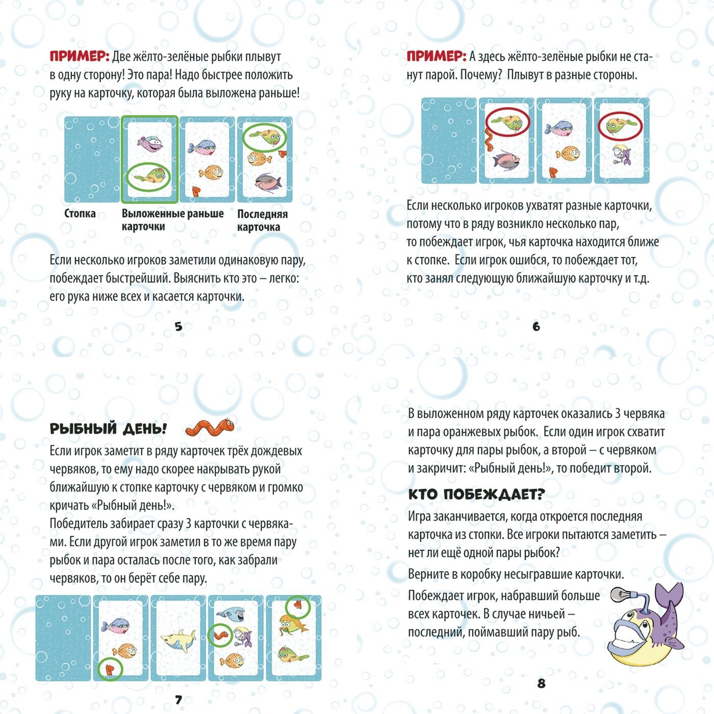 Рыбки кувыркаются и блестят чешуёй в пруду. Каждый удачливый рыболов хочет поймать много рыбы! Но это не так просто – ведь ловить рыбок можно только парами или надеяться на наступление Рыбного дня! Игроки поочерёдно выкладывают в ряд карточки из общей стопки. Тот, кто первым заметит рыб одинаковой расцветки плывущих в одну сторону, забирает эту пару карточек. А если игрок заметит трёх червяков, то он немедленно громко оповещает всех – наступил: «Рыбный день!», - и получает карточки с червяками! Отличная тренировка наблюдательности юных рыболовов. Такую рыбалку хочется повторить