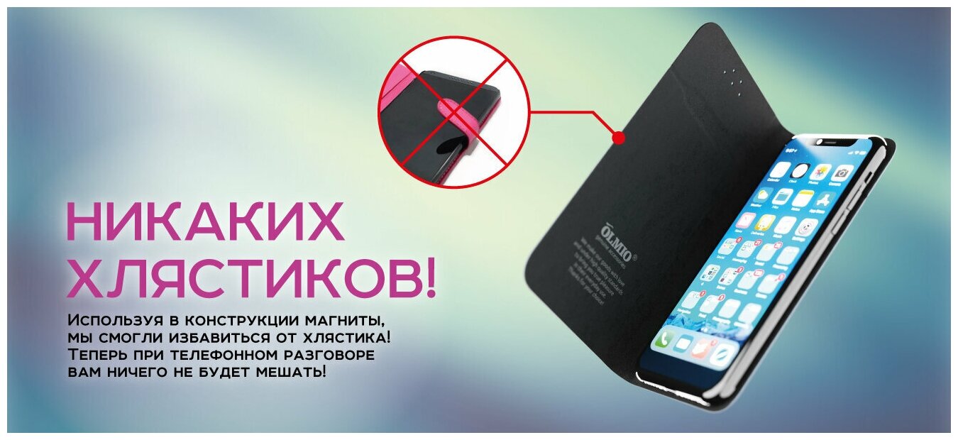 Не хочется тратить время на поиски чехла для телефона или аксессуаров для нужной модели нигде не найти? Загляните в каталог интернет-магазина Partner! Представляем универсальный чехол-книжку Olmio, что подойдет большинству аппаратов с диагональю экрана от 5,5 до 6,5 дюймов.Магнит вместо застежки Чехол остается закрытым или открытым без дополнительных хлястиков, застежек или ремешков. Просто и удобно!Режим съемки Вам не придется вынимать гаджет из чехла, чтобы использовать камеру смартфона: верхняя часть бук-кейса отгибается на 180 градусов и фиксируется магнитом. Поэтому чехол такой конструкции подходит смартфонам с любым расположением тыловой камеры. Бархатистая подкладка Подкладка из бархатистой микрофибры не поцарапает корпус телефона. Широкая клеевая полоса Крепко удерживает смартфон, даже фаблеты с большой диагональю, за счет широкой клеевой полосы. Полоса многоразовая, телефон легко переклеить. Ультратонкий Чехол защищает смартфон, но визуально не увеличивает его и не утяжеляет.Благородные цвета Помимо серебристо-серого, аксессуар представлен в черном, бордовом, темно-синем и золотом цветах.