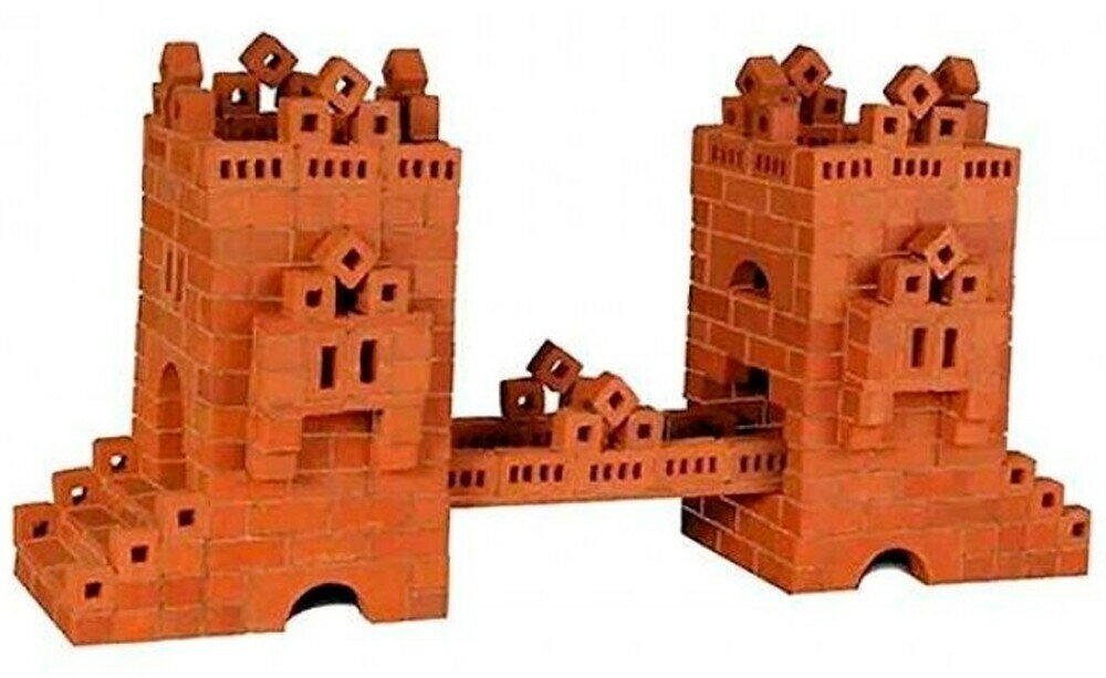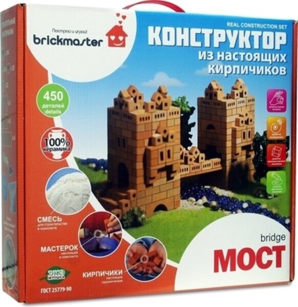 В набор "Мост" входит 450 деталей: кирпичики, арки и другие элементы разных форм и размеров. Следуя инструкции, ребенок сможет построить самый настоящий мост — только миниатюрный. Благодаря разнообразию элементов, готовая постройка будет выглядеть практически как величественный Тауэрский мост. Конструкторы Brickmaster не похожи ни на одни другие. Элементы конструктора — это практически настоящие кирпичики. Они изготавливаются из обоженной глины по технологии настоящих кирпичей, но в меньшем размере. Кирпичики скрепляются между собой строительной смесью, как в большом строительстве. Смесь для скрепления состоит из песка и крахмала, поэтому она совершенно безвредна. Она легко растворяется в воде, что позволяет многократно перестраивать уже собранное здание. Чтобы разобрать готовое сооружение, нужно просто опустить его в воду на несколько часов. Кирпичи от этого не пострадают.
