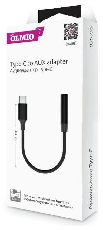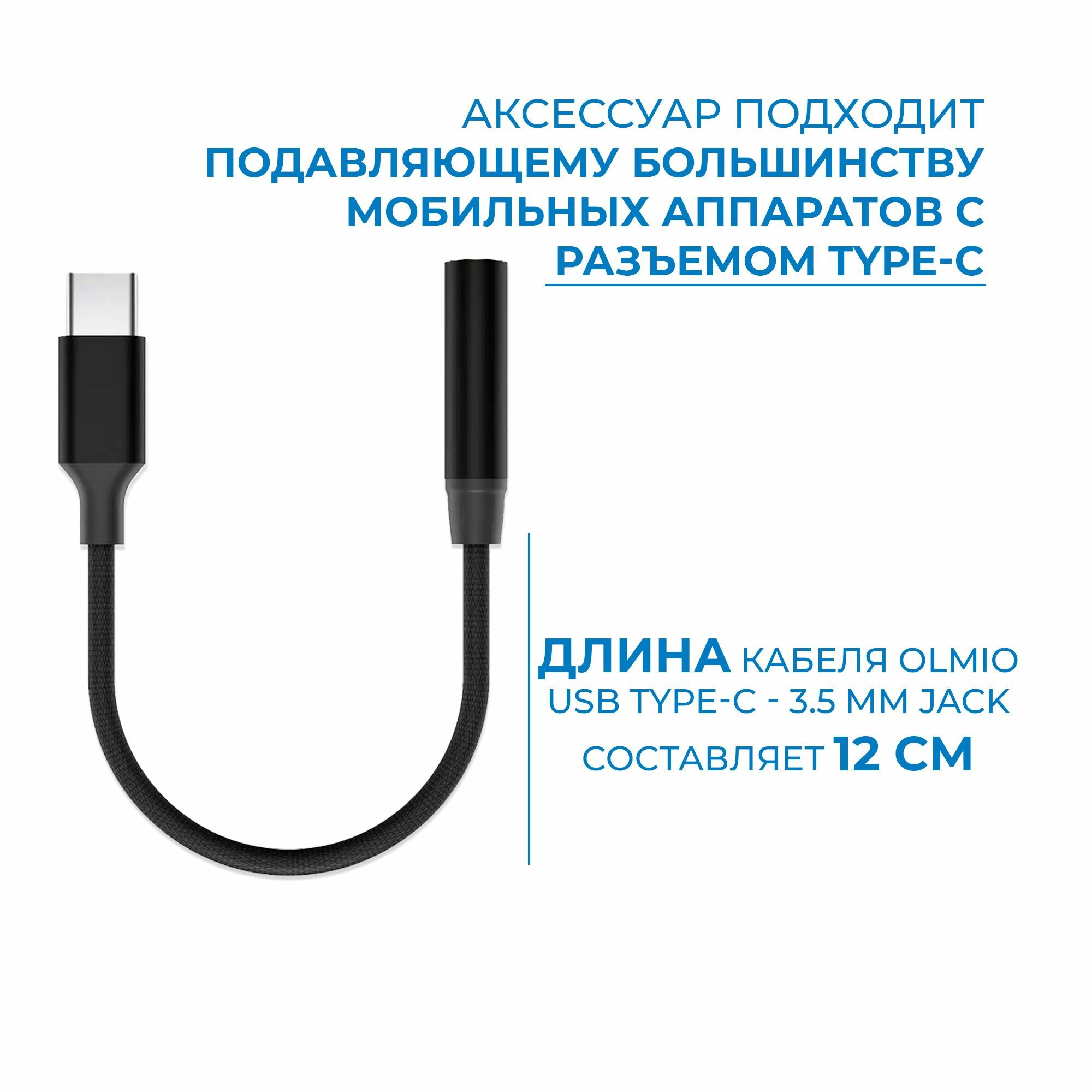 Адаптер-переходник Olmio позволяет подключать устройства с разъемом Type-C к аудиоустройствам с разъемом AUX 3.5 мм. Он позволяет передавать звук с вашего устройства на наушники или колонки.