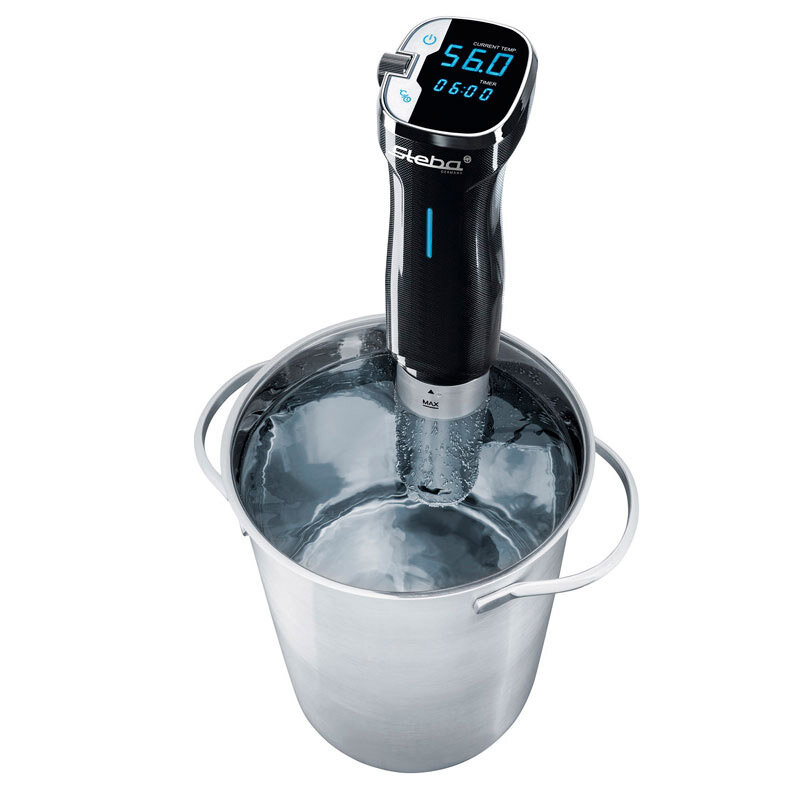 Аппарат для готовки по технологии су-вид Steba с корпусом из нержавеющей стали оборудован профессиональной системой циркуляции воды, служащей для очень точного регулирования температуры. Точность измерения температуры регулируется с шагом 0.5°C до 90°C. Аппарат имеет простое управление с сенсорным дисплеем, функцию быстрого нагрева воды.