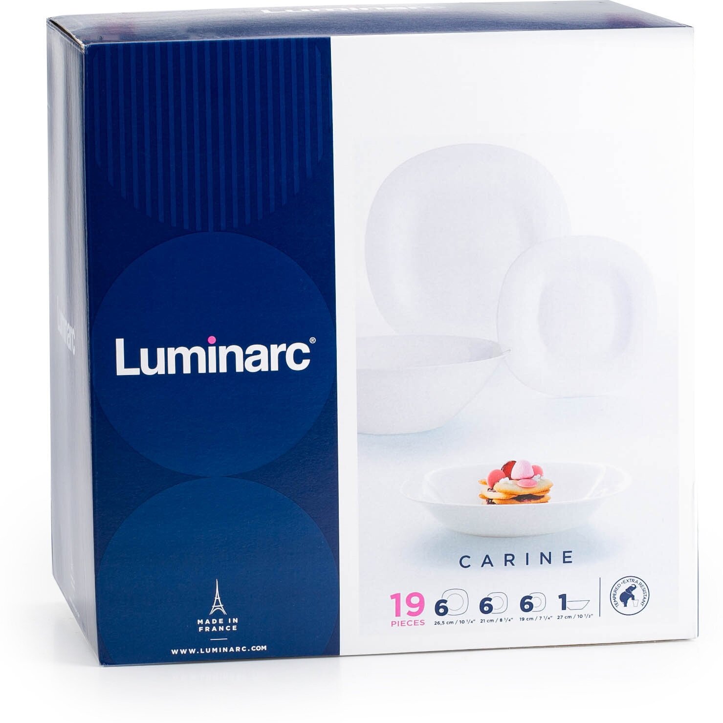Белый сервиз Carine стал классикой Luminarc, он популярен много лет и популярность его не убывает - на сегодняшний день Luminarc предлагает коллекции черного и серого цвета той же линейки. Белый Карин можно использовать, как ежедневную и профессиональную посуду.