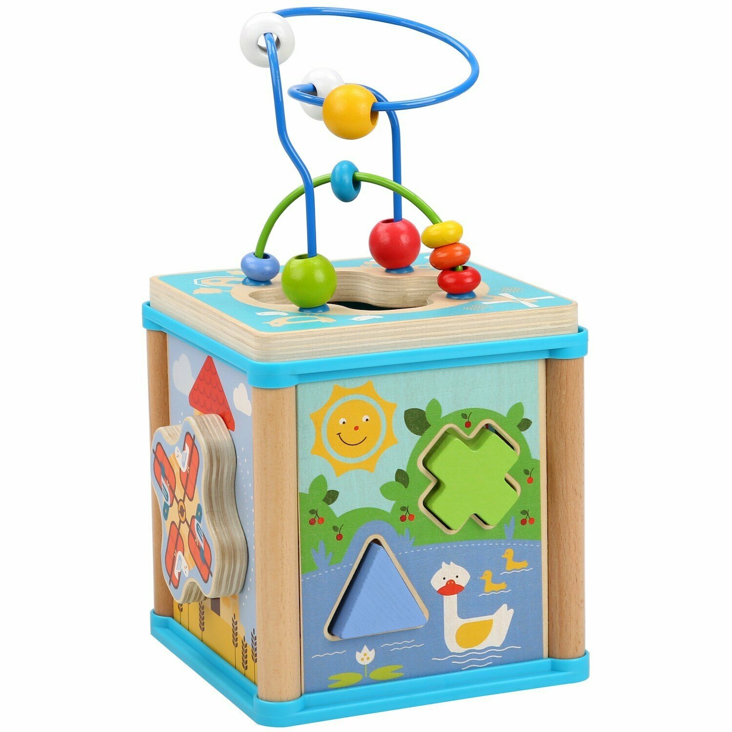 Универсальный деревянный куб - развивающая игрушка для малышей в возрасте от 3 лет. Включает в себя сразу несколько обучающих и развлекательных элементов. Сверху на деревянном кубе располагается развивающий лабиринт, дающий возможность передвигать по изогнутой проволоке цветные элементы.