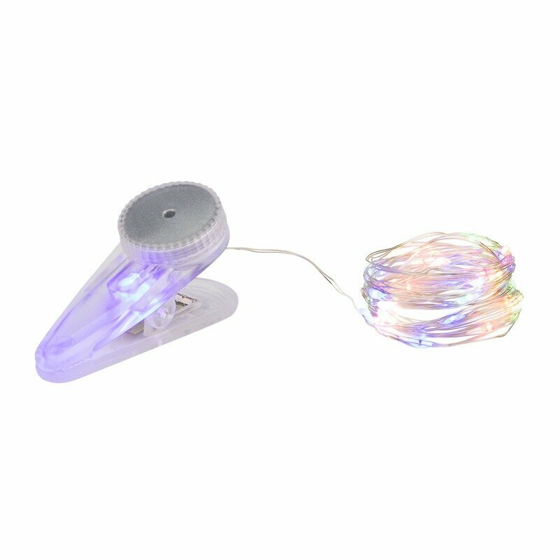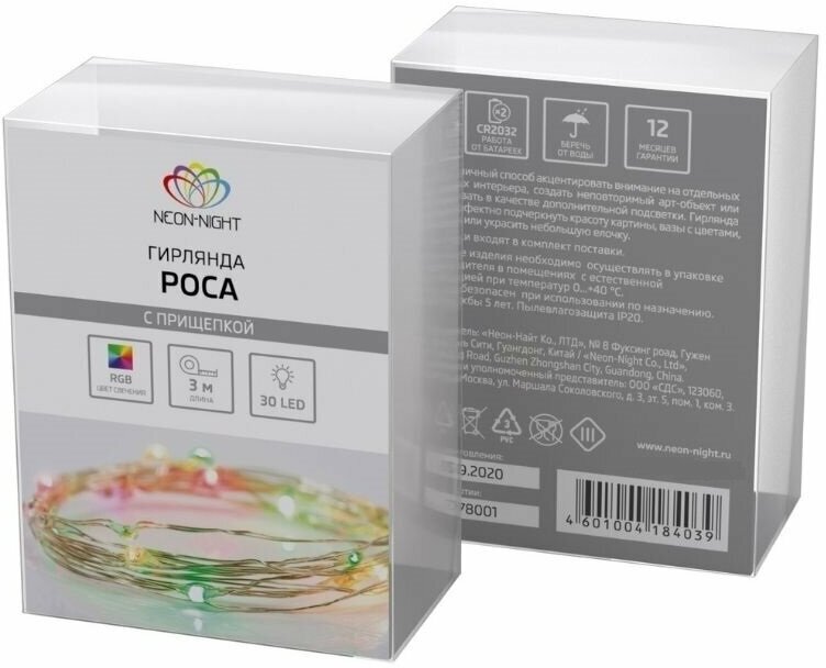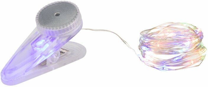 Гирлянда состоит из тонкого провода длиной 3 метра, с расположенными на нем 30 разноцветными долговечными светодиодами. В качестве питания выступают батарейки 2хСR2032.