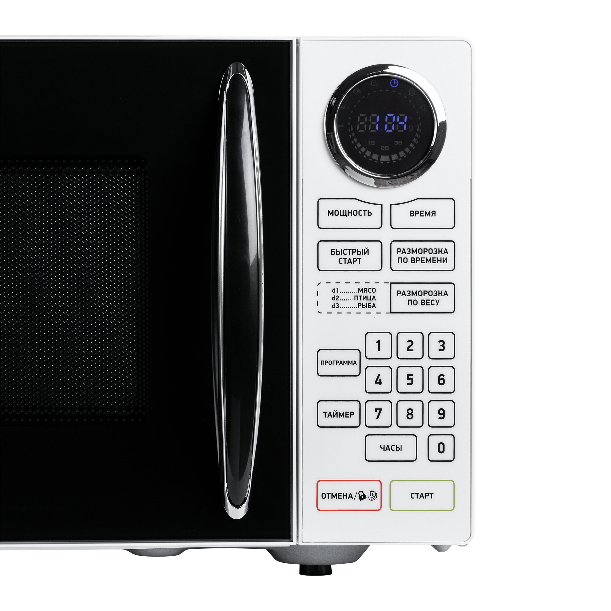 Микроволновая печь с объемом камеры 23 литра и мощностью 900 Вт предназначена для приготовления средних и крупных порций блюд. Для настройки параметров работы печи вручную выберите 1 из 10 уровней мощности и введите время от 00:01 секунды до 99:99 минут. Рецепты из нескольких этапов