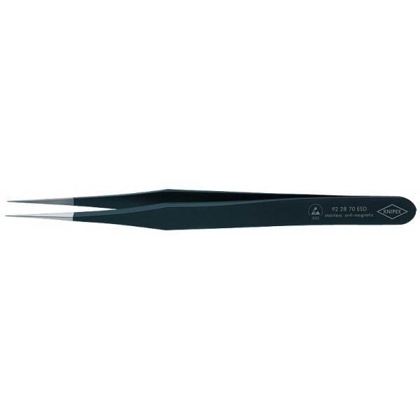 92 28 70 ESD Универсальный пинцет ESD Безопасная работа с электронными компонентами в прецизионных областях применения: пинцет контролируемым образом компенсирует разность потенциалов между оператором и компонентом. Покрытие из черной эпоксидной смолы, прошедшее испытания на электростатический разряд, с поверхностным сопротивлением в диапазоне 10 ^ 4 – 10 ^ 9 Ом. Для электроники и прецизионного приборостроения. Антимагнитные характеристики, чтобы избежать электромагнитного повреждения. Широкий выбор вариантов конструкции: прямые, угловые, с гладкими или шершавыми захватными поверхностями и ручками, со вставочными иглами, с узкими или тупыми наконечниками. Высококачественная нержавеющая сталь обеспечивает чрезвычайную жесткость и очень хорошую коррозионную стойкость в различных атмосферных средах и со многими коррозионными материалами. . - Поверхность: матовая поверхность - исполнение: прямой - Ширина наконечников (A): 0,2mm - Ширина наконечников (B): 0,25mm - Версия Наконечник пинцета