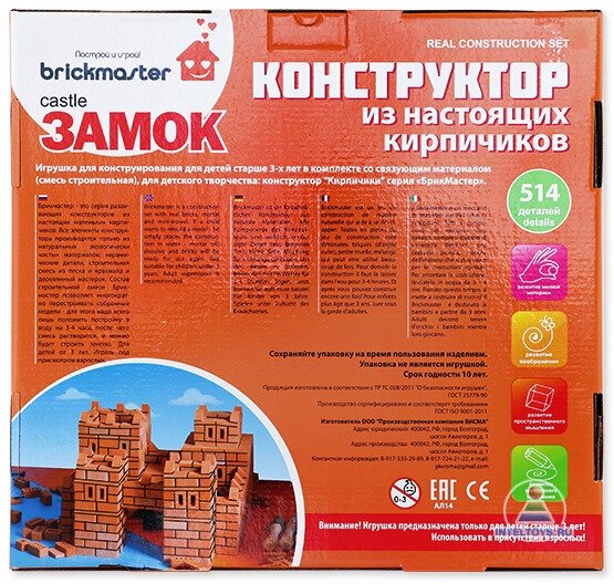 В наборе 514 разных строительных элементов, из которых получится настоящий замок из средневековья с четырьмя башнями и бойницами. Он может послужить домиком для кукол и других игрушек или украсить интерьер детской комнаты. Конструкторы Brickmaster не похожи ни на одни другие. Элементы конструктора — это практически настоящие кирпичики. Они изготавливаются из обоженной глины по технологии настоящих кирпичей, но в меньшем размере. Кирпичики скрепляются между собой строительной смесью, как в большом строительстве. Эта особенность конструктора позволяет детально воспроизвести строительный процесс.