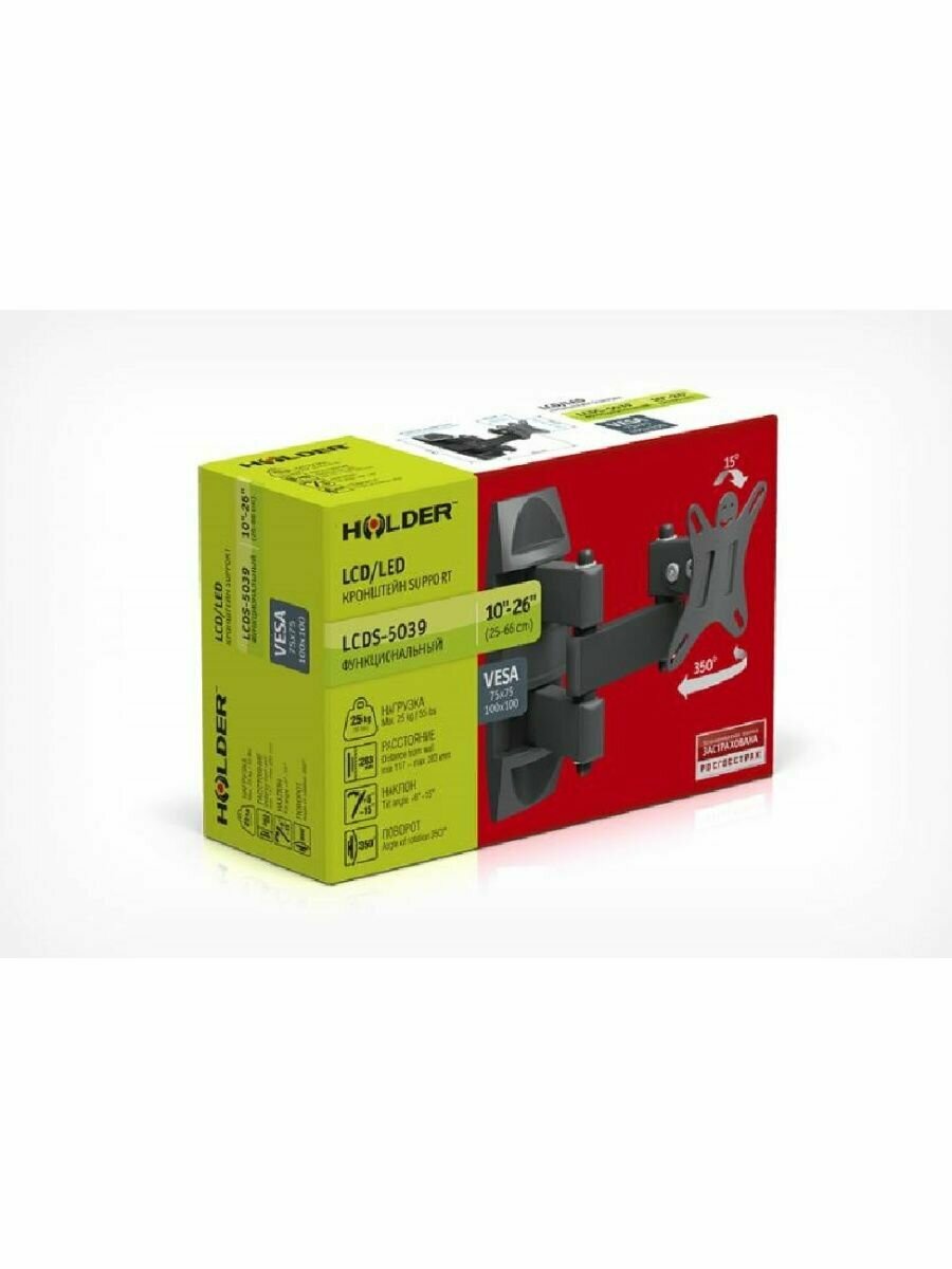 Кронштейн Holder LCDS-5039 обеспечит крепление вашего LCD телевизора с диагональю 10-26 дюймов на стене. Расстояние от стены, на которое можно подвешивать телевизор, составляет 117-283 мм. Кронштейн разработан в соответствии со стандартом VESA. Он выдержит нагрузку до 25 кг. Размер крепежных отверстий равен: 75х75 мм, 100х100 мм. Это функциональный кронштейн, который дает возможность менять угол наклона на 15 градусов и поворачивать телевизор на 350 градусов. Вы сможете наслаждаться просмотром телевизора независимо от места, в котором находитесь в комнате. Это идеальный вариант для студий или для размещения в углу комнаты.