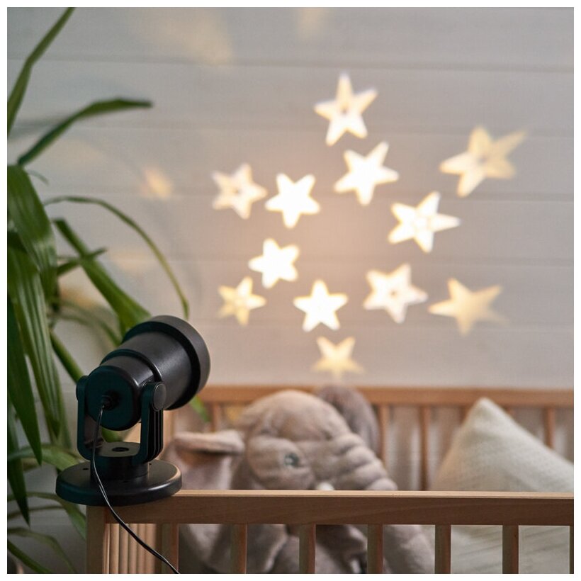 Проектор используется для создания вечеринки и уютной атмосферы в детской комнате. Проекции звездочек теплого мягкого свечения отражаются на стенах, потолке и мебели. В работе бесшумен и безопасен благодаря понижающему трансформатору (в комплекте). Рекомендуемое расстояние для проекции: до 10 м.